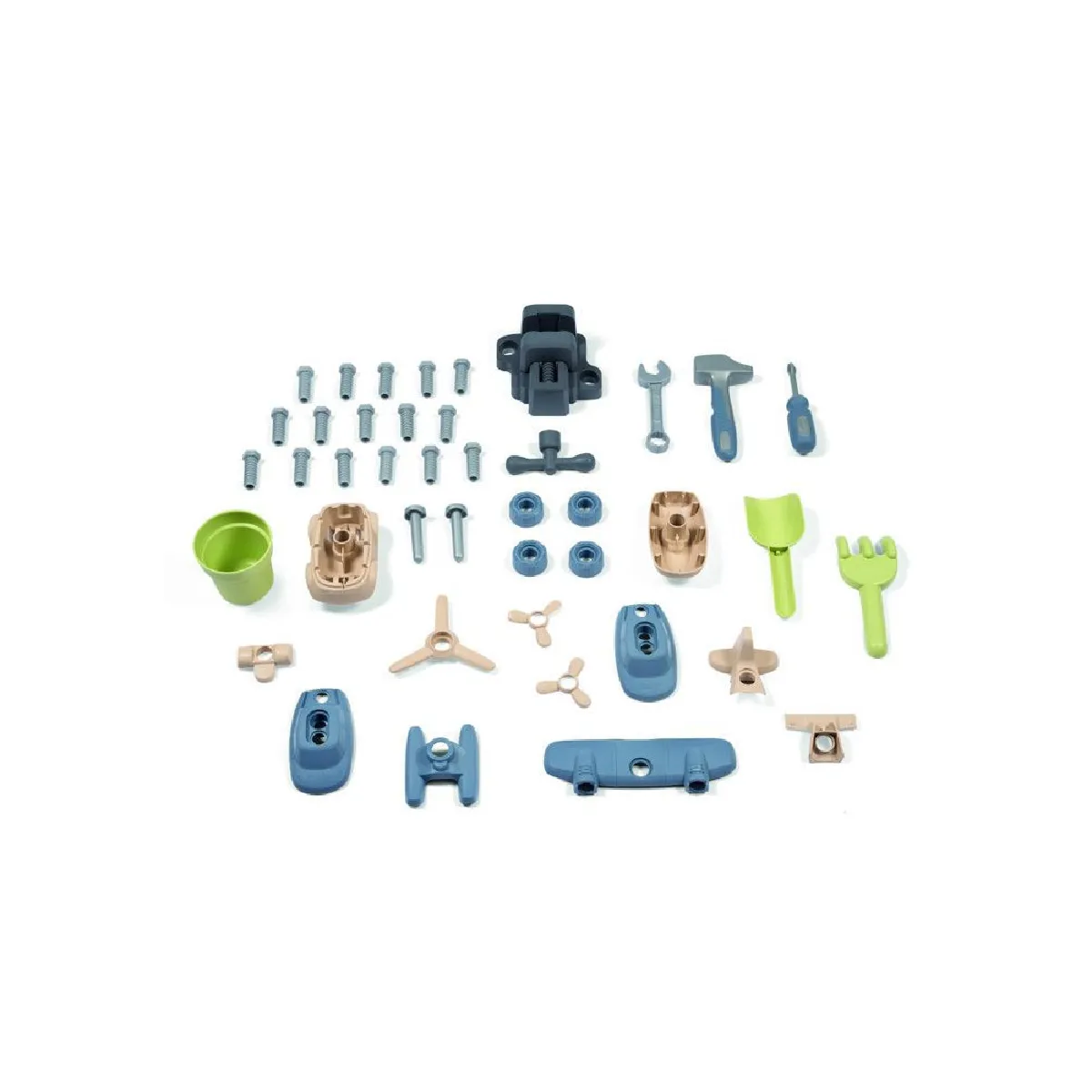 - Accessoires inclus : 39 accessoires (ex. : marteau, tournevis, pelle, râteau, tap-tap clou, véhicule à construire).