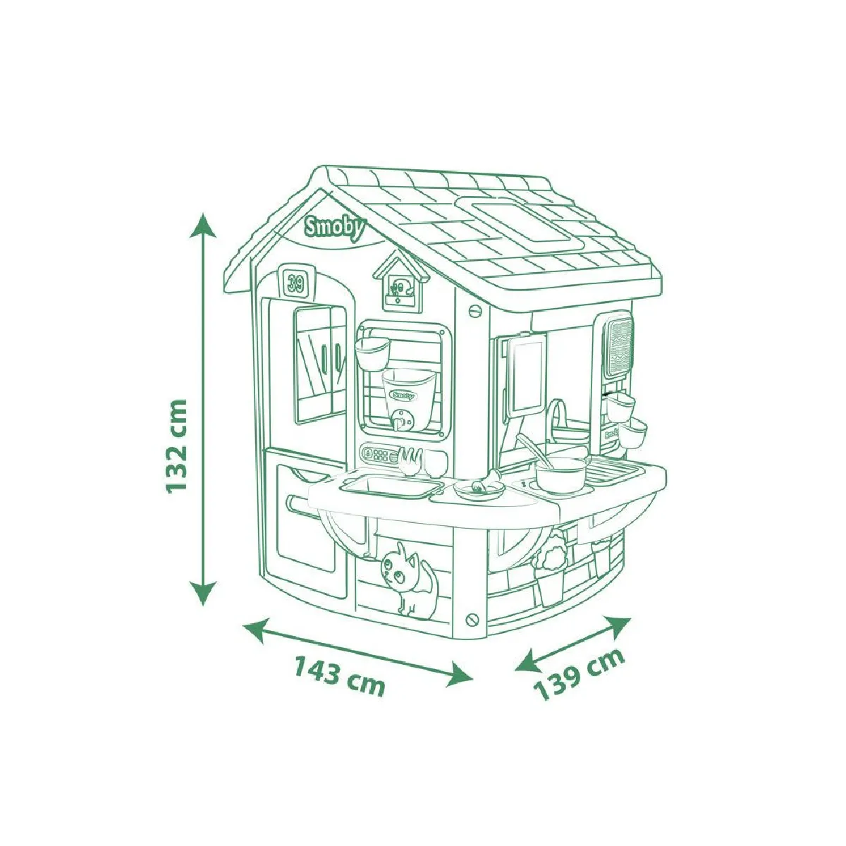 La Maison Smoby Life Mud Cooking est une maisonnette de jeu conçue pour encourager le jeu d'imitation et les activités de "cuisine boueuse" en intérieur comme en extérieur, à partir de 2 ans. Stable et spacieuse, elle propose un grand plan de travail avec guichet de service, deux portillons à charnières, deux fenêtres avec volets verts décoratifs et un toit en pente imitation tuiles équipé d'une lucarne. Un petit tableau ardoise permet aux enfants d'afficher le menu du jour tandis que des moulures décoratives (petit animal sur la face avant) ajoutent du caractère à la structure.