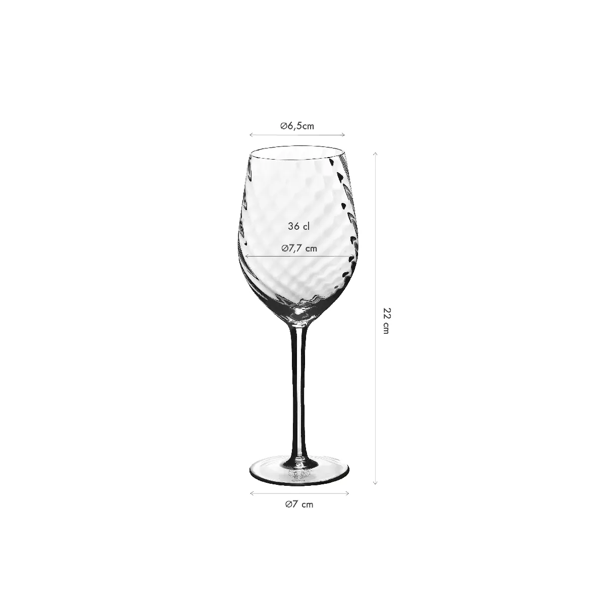 Avec ses lignes sobres et sa contenance de 36 cl, ce verre à pied est idéal pour les vins blancs, rosés ou rouges. Sa texture en spirale ajoute une dimension visuelle subtile, animant le calice de reflets changeants qui valorisent chaque service avec élégance.