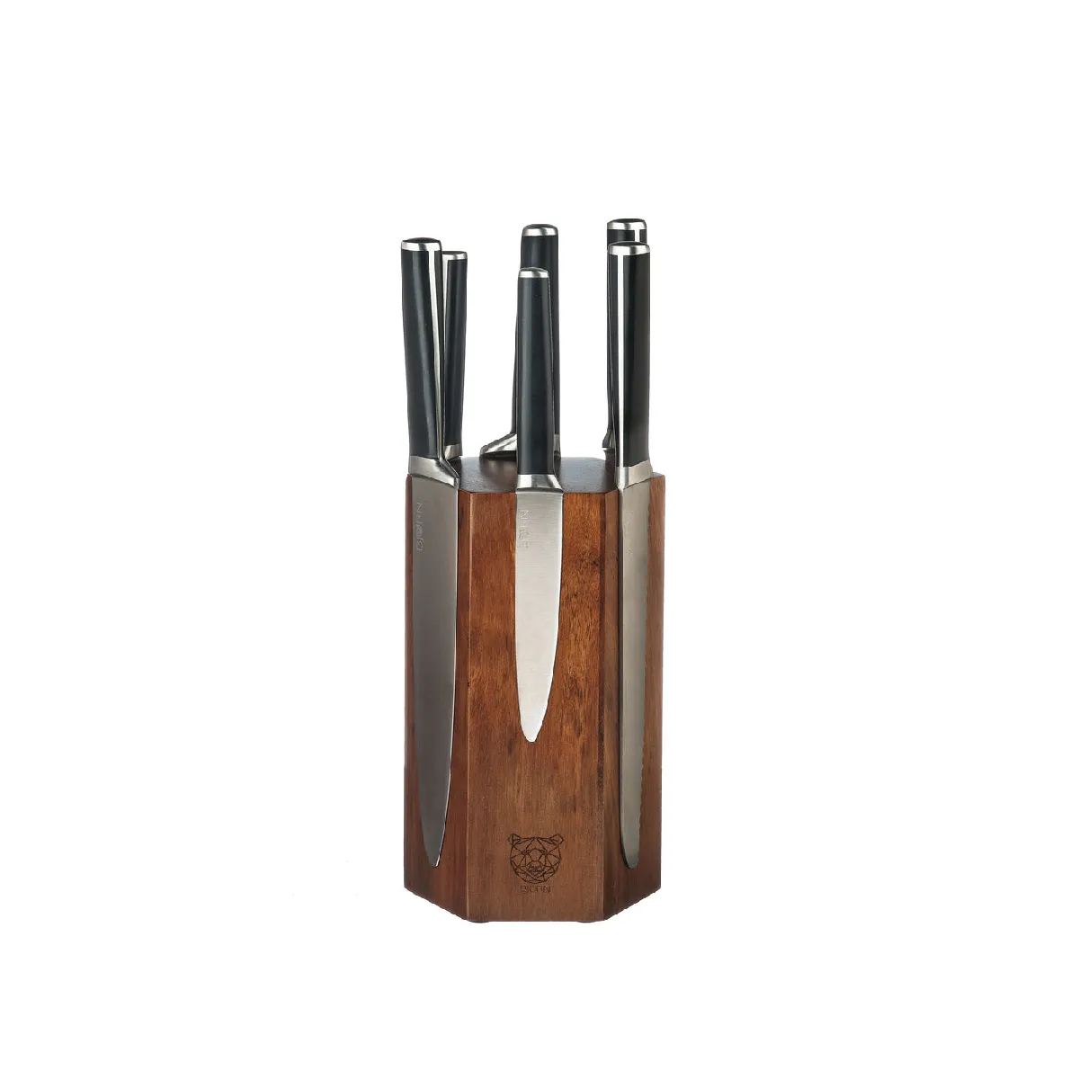 Qui dit hexagone, dit 6 faces conçues pour accueillir jusqu'à 6 couteaux de cuisine avec ses aimants intégrés et puissants. Cette forme particulière permet non seulement une disposition pratique et confortable, mais elle ajoute une dimension artistique à votre plan de travail. Fabriqué en bois d'acacia, ce bloc apporte une chaleur naturelle dans votre cuisine, qu'elle soit classique ou moderne, et en fait un espace d'inspiration.