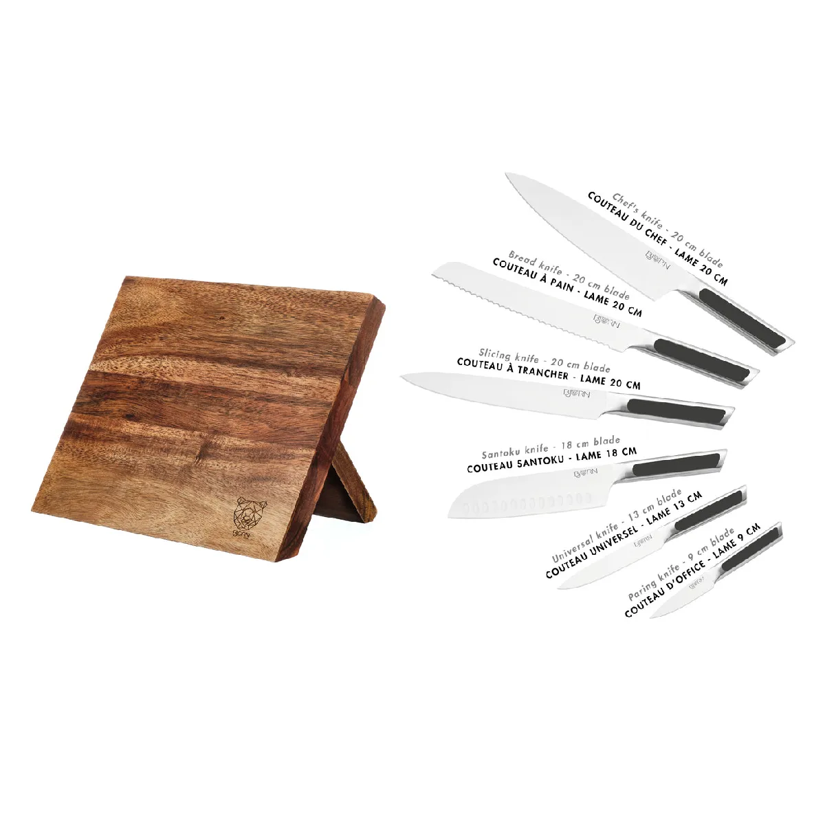 Faire le choix du bloc couteau VANTAA c'est opter pour le côté pratique & chic. Confectionné avec soin en bois d'acacia verni, il présente une apparence design et minimaliste. Il comporte de puissants aimants intégrés, créant une surface entièrement magnétique qui maintient solidement vos couteaux en place. Le support pliable à l'arrière offre une stabilité pendant l'utilisation et se replie facilement pour un rangement compact. Cette fonctionnalité vous permet de ranger facilement le bloc lorsqu'il n'est pas utilisé tout en conservant un maintien des couteaux. Le bloc magnétique VANTAA représente non seulement une solution de rangement ingénieuse, mais aussi un élément de décoration original dans le séjour ou la cuisine.
