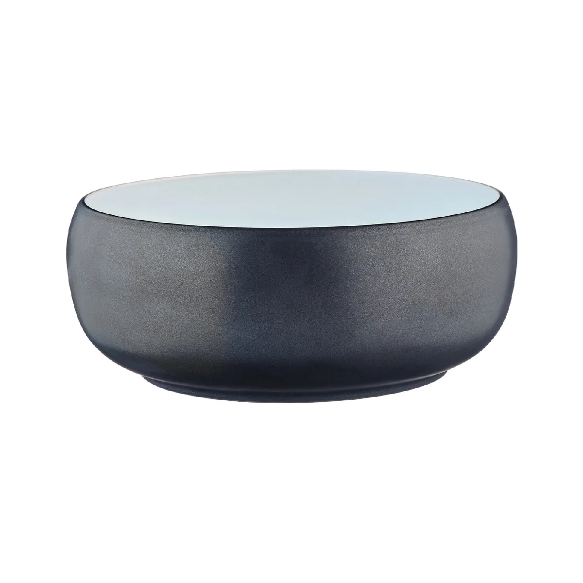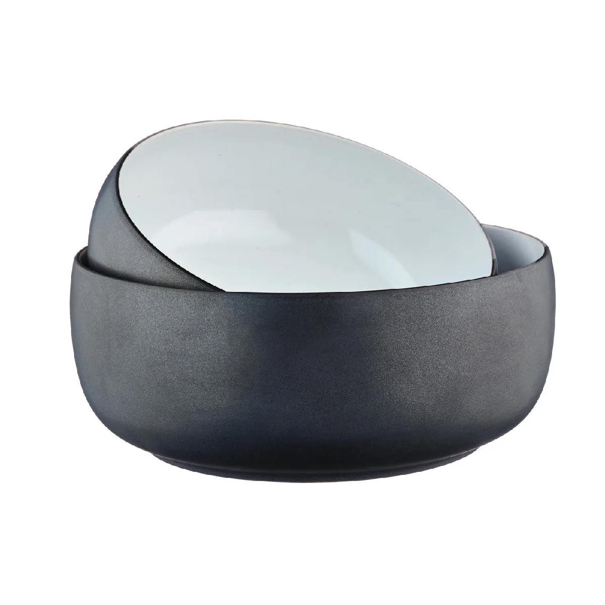 L'extérieur de chaque pièce révèle une finition matte et brute de couleur noire onyx aux reliefs granités brillants. A l'intérieur on retrouve un émail réactif blanc légèrement moucheté qui apporte une note minérale à la présentation. Cette association subtile se marie parfaitement avec la forme organique de chaque élément et donne un visuel naturellement spectaculaire.