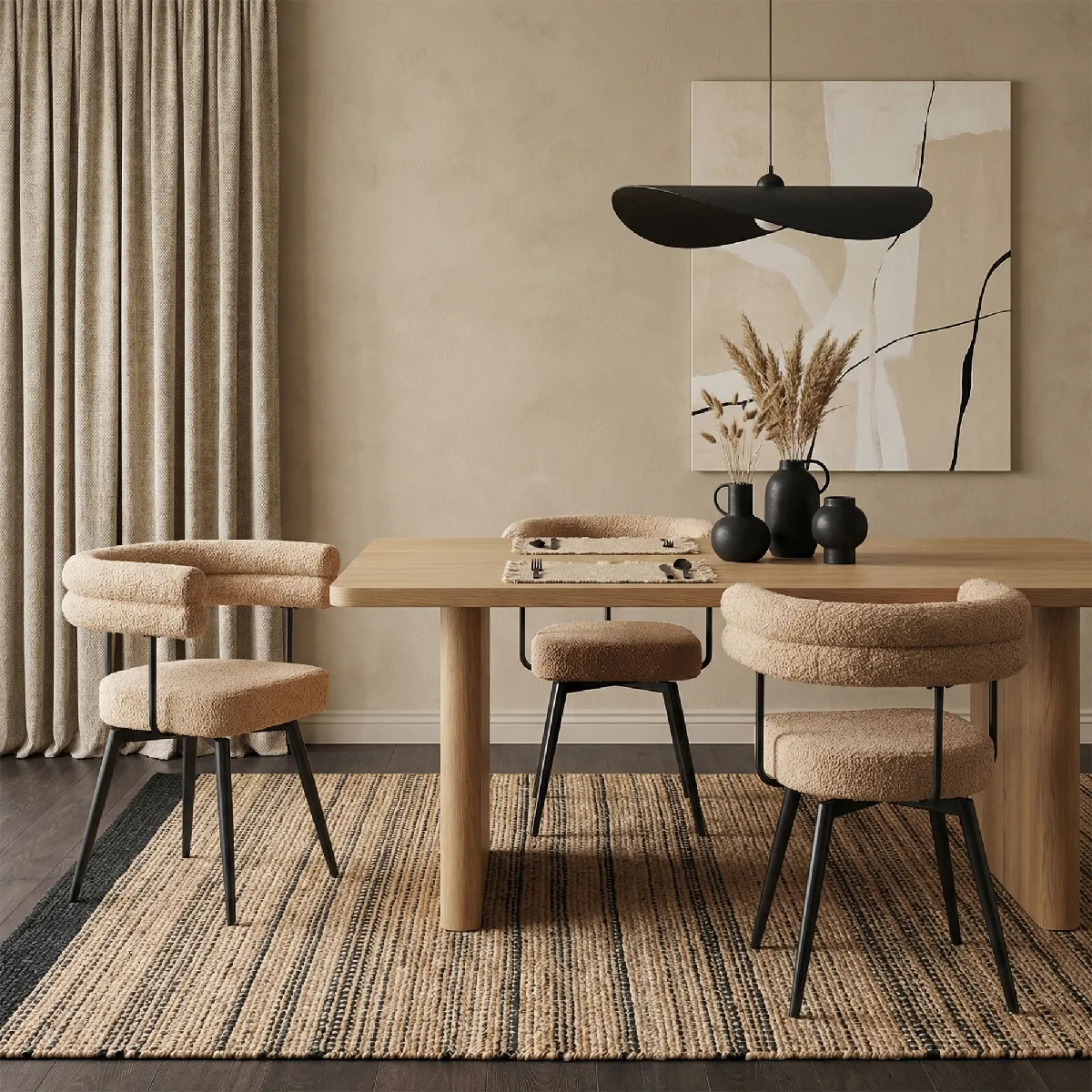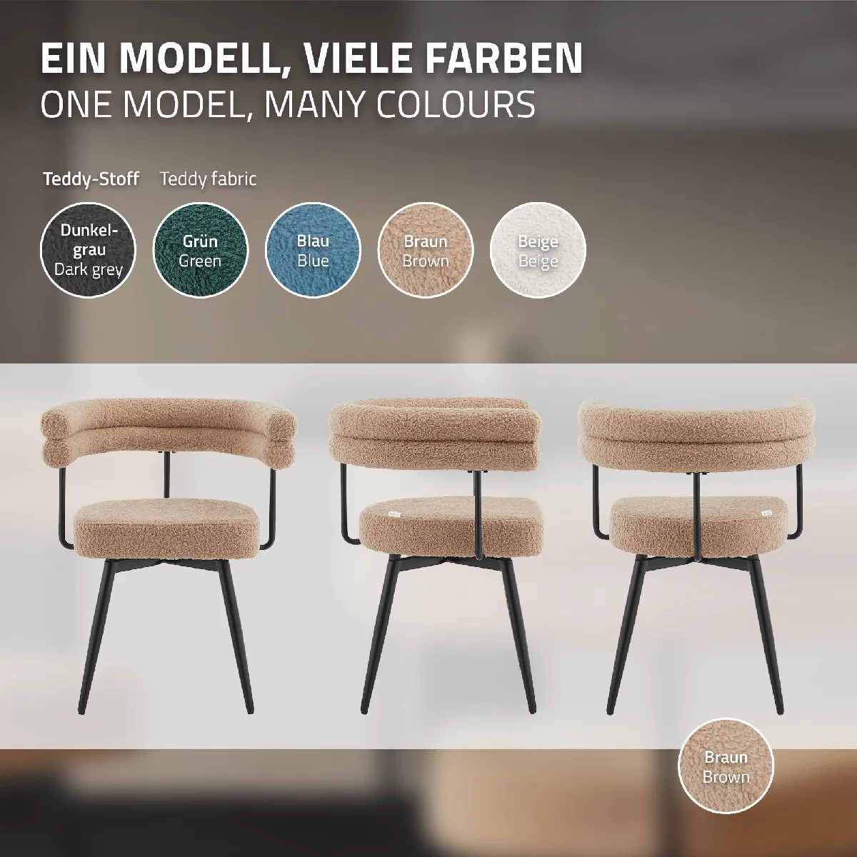 Cet ensemble moderne de chaises de salle à manger séduit par son design élégant et son grand confort d'assise. L'assise rembourrée et le dossier agréablement incurvé sont recouverts d'un tissu Teddy de haute qualité et offrent un confort d'assise particulièrement agréable. Le design intemporel peut être combiné de nombreuses façons, ce qui le rend idéal pour la salle à manger, la cuisine ou le salon.