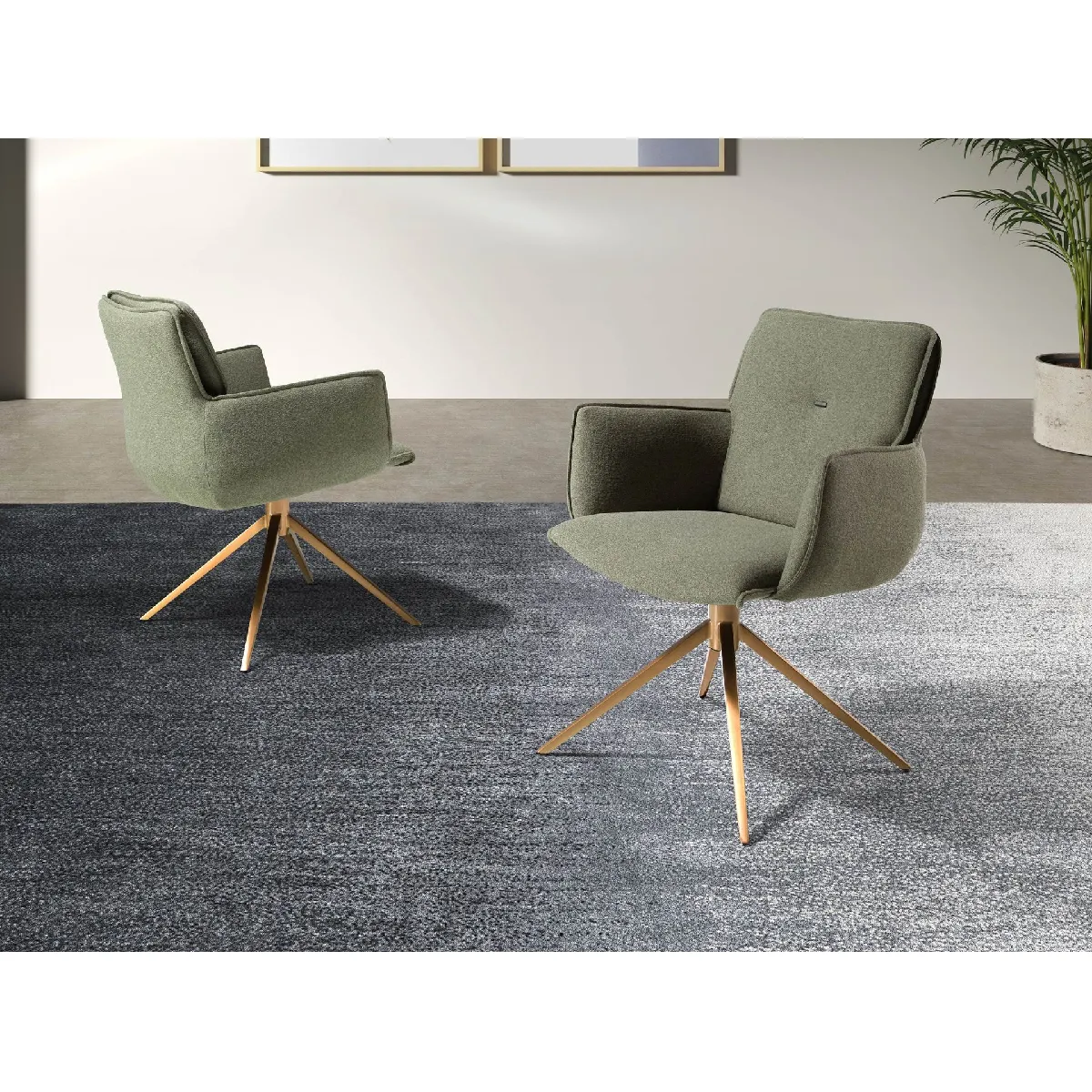 Chaise pivotante Angel Cerdá 4238 en tissu vert olive avec accoudoirs et piètement bronze, mousse PU 25 kg/m3, 62 x 75 x 83 cm.