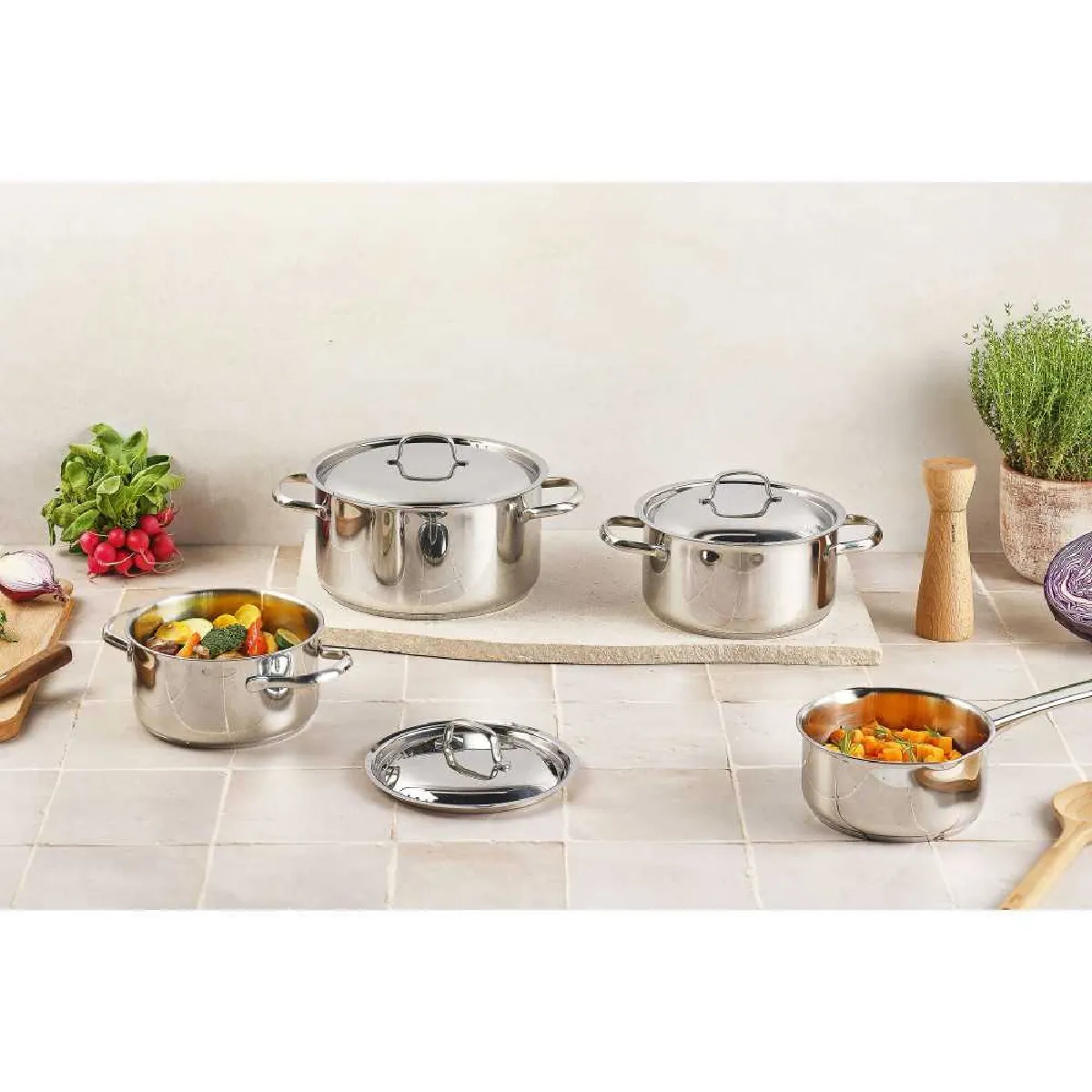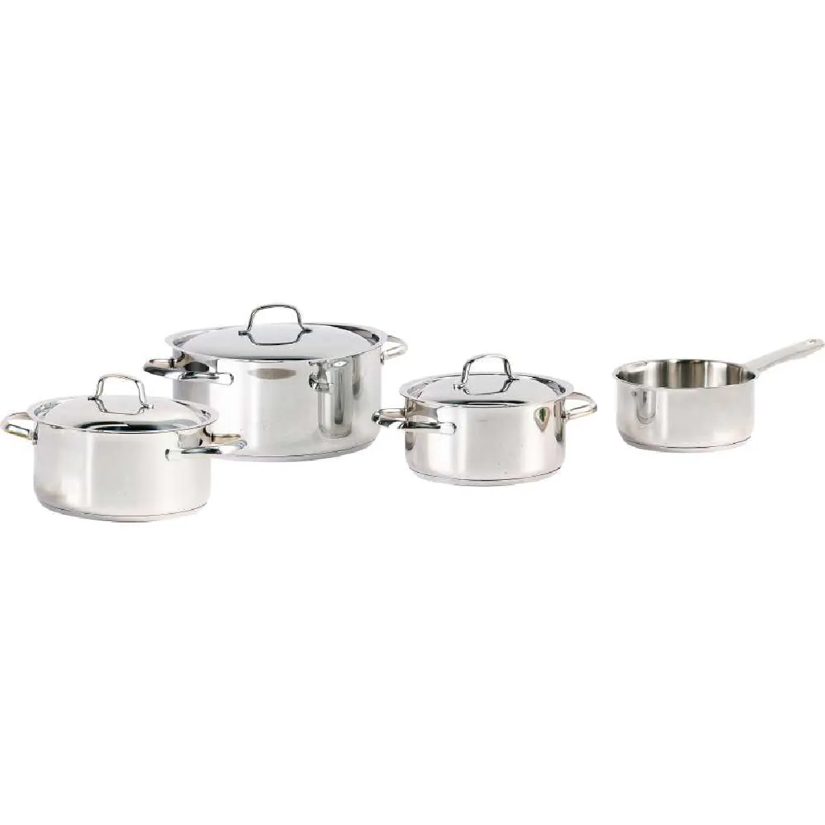 - Contenu du set : grand faitout avec couvercle, faitout moyen avec couvercle, petit faitout avec couvercle, casserole avec long manche (sans couvercle)