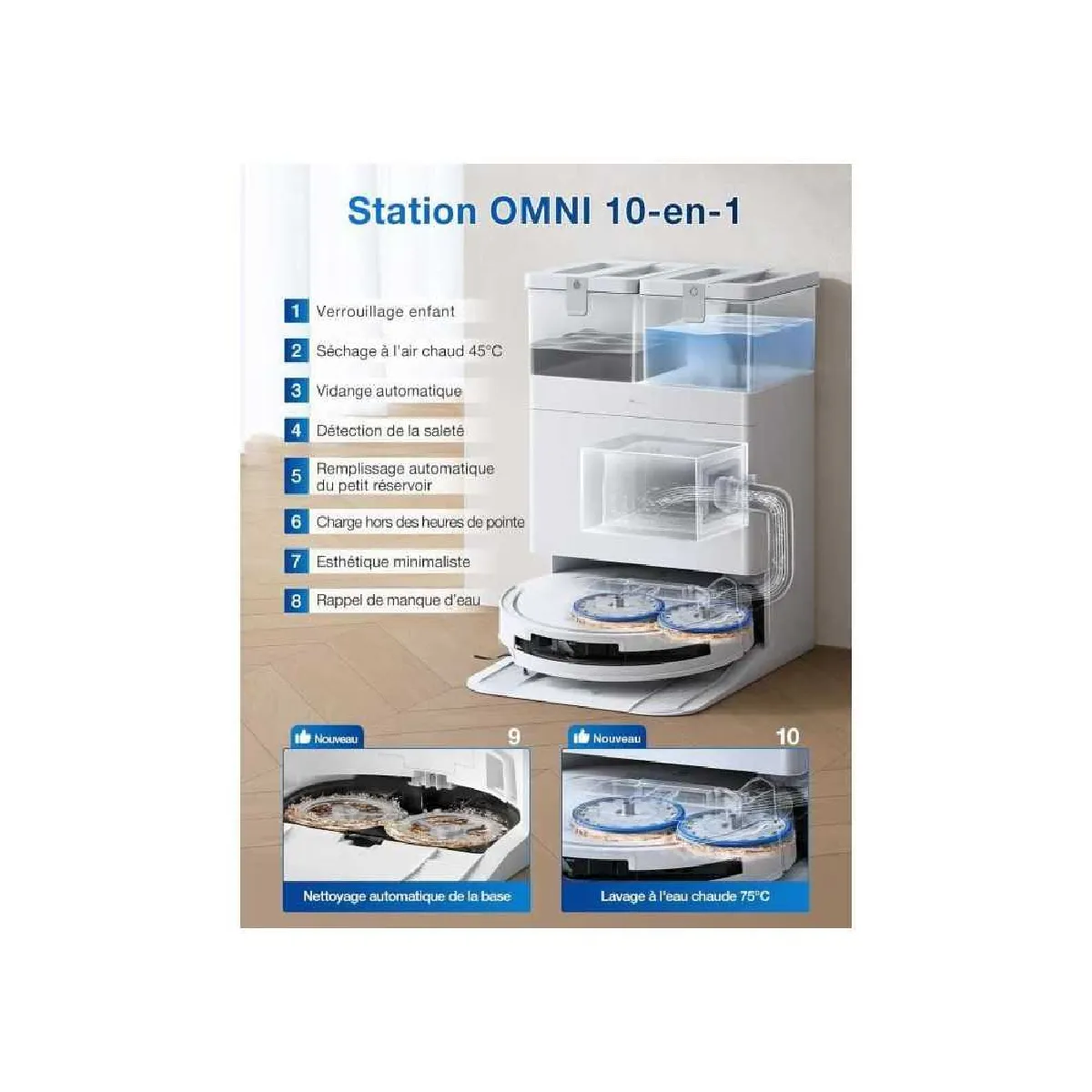 - Station OMNI multifonction : auto-vidage de la base poussière 3 L, lavage des tampons à l'eau chaude jusqu'à 75 °C, séchage à l'air chaud à 45 °C, remplissage automatique et purification.