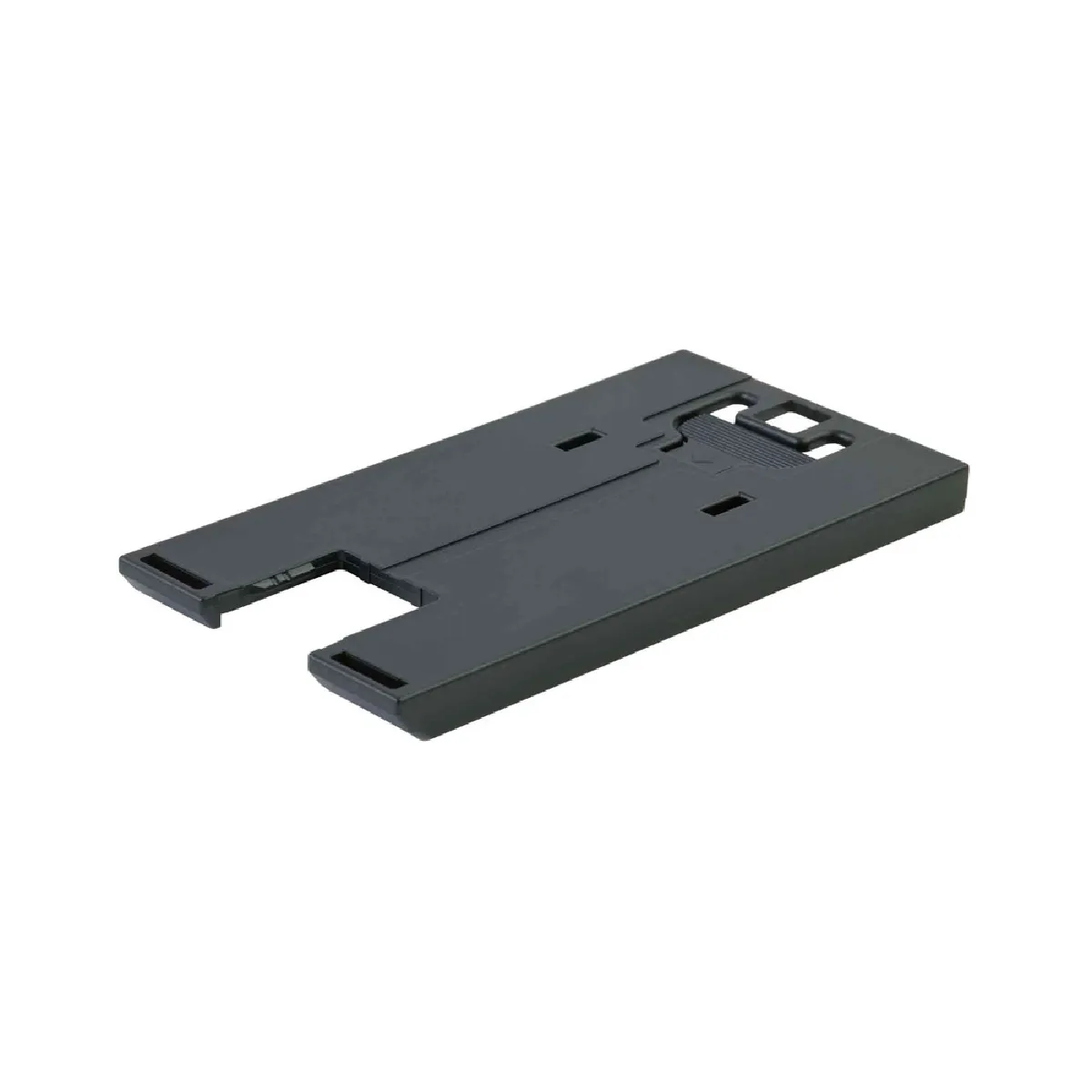 Cette semelle est équipée d'une découpe en U centrale pour le passage de la lame, de deux fentes de fixation près du centre et d'ouvertures arrière avec zone striée pour l'enclenchement ou le déverrouillage. Des évidements longitudinaux à l'avant améliorent la stabilisation et le guidage. Le design favorise un glissement fluide sur le bois et matériaux proches du bois tout en préservant la qualité du chant de coupe.