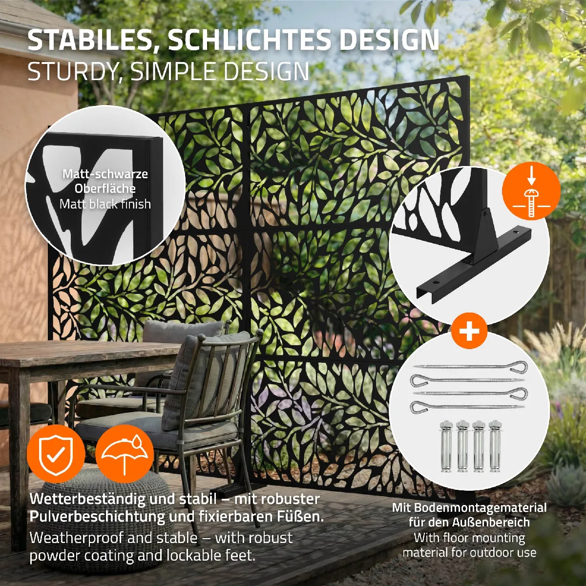 Grâce au système modulaire composé de trois panneaux, le brise-vue peut être monté de manière particulièrement flexible. Le modèle de 120 cm offre 6 possibilités de montage différentes - entièrement vertical, horizontal, en module double ou simple. Vous pouvez ainsi adapter la largeur et la hauteur de manière optimale à votre espace.