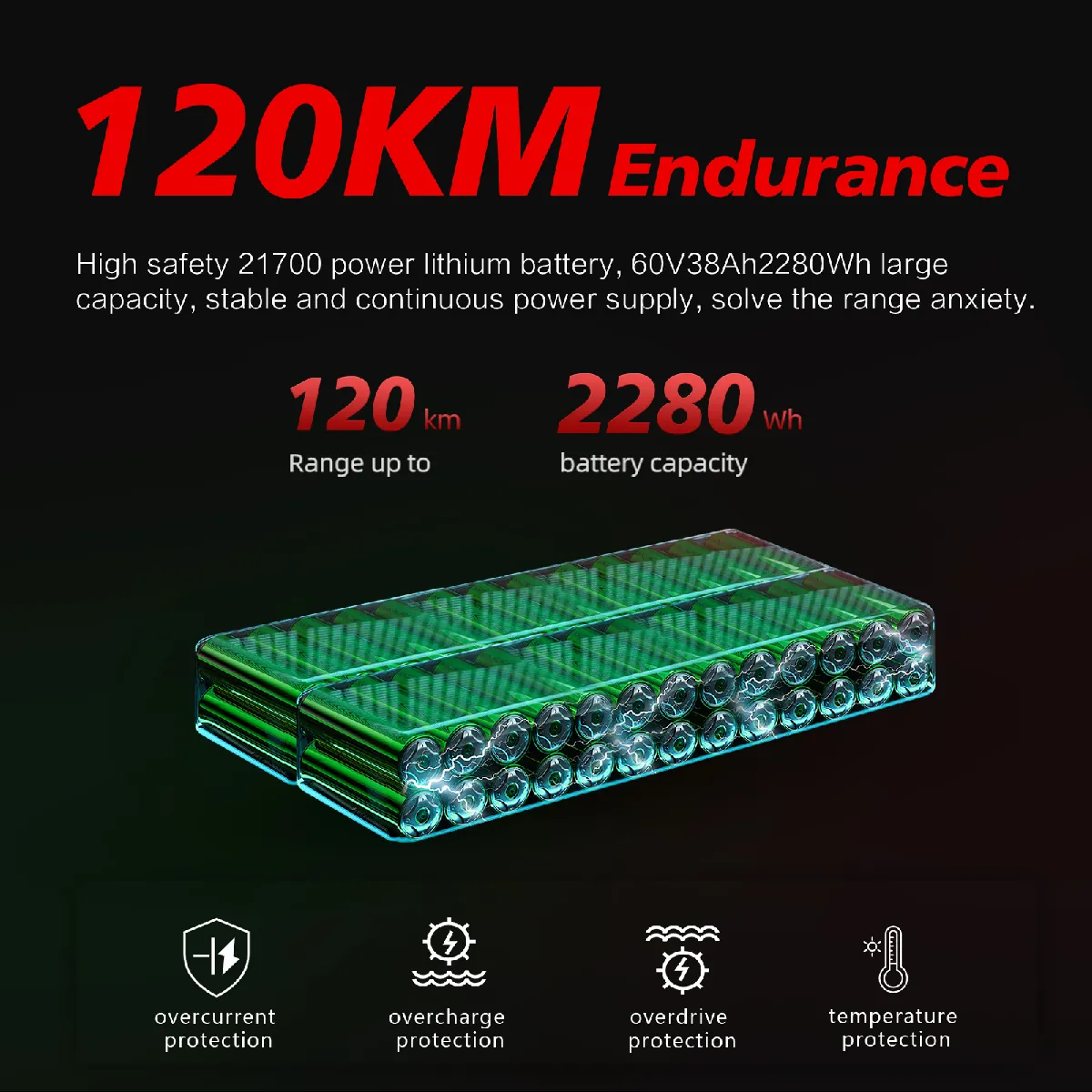 Dotée d'une batterie lithium-ion de haute capacité de 60V 38Ah, elle offre un zéro d'autonomie allant de 100 à 120 km. Vous pouvez ainsi entreprendre de longues excursions, explorer de nouveaux paysages ou effectuer vos trajets quotidiens sans avoir à vous soucier constamment de la recharge, profitant pleinement de chaque instant de conduite.