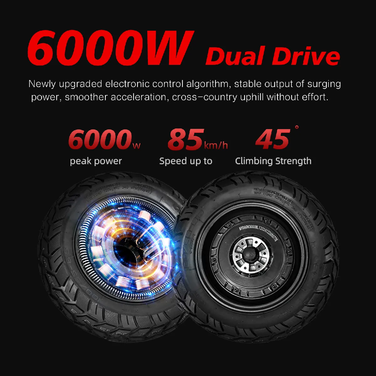 Cette trottinette électrique est équipée d'un double moteur de 6000 W, propulsant la machine à une vitesse maximale impressionnante de 85 km/h. Que ce soit pour affronter les routes urbaines avec dynamisme ou pour profiter d'une sensation d'adrénaline lors de balades en pleine nature, cette puissance assure une accélération rapide et une conduite énergique, vous faisant sentir pleinement la puissance sous vos mains.
