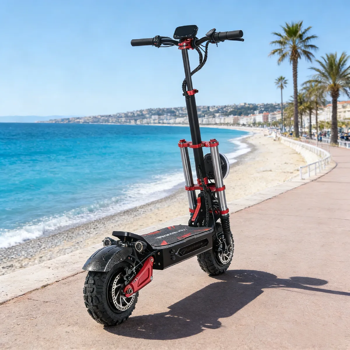 Commentaire vendeur : Cette trottinette électrique allie performances exceptionnelles et confort optimal. Équipée d’un double moteur 6000W et d’une batterie 60V 38Ah, elle atteint 85 km/h avec une autonomie de 100-120 km et peut gravir des pentes de 45°. Son siège ajustable et sa structure pliable en aluminium assurent praticité. Sécurisée grâce aux freins hydrauliques et amortisseurs performants, elle intègre écran LCD, NFC, application Bluetooth et éclairage LED dynamique. Un design stylé et un service client complet complètent ce modèle haut de gamme.