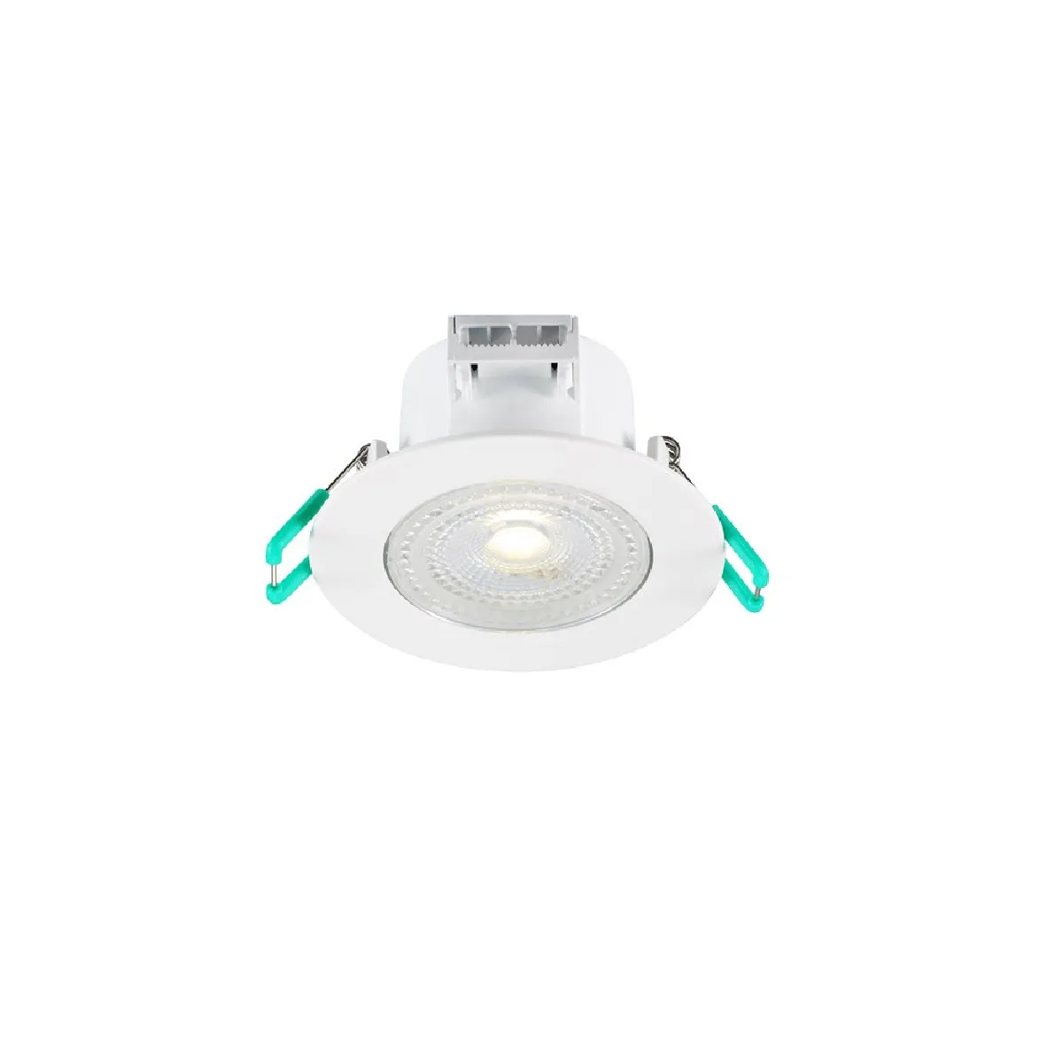 Le produit est livré avec une bague extérieure additionnelle argentée et des ressorts de fixation munis d'embouts plastiques verts pour faciliter la pose. Diffuseur texturé couvrant la LED inclus.