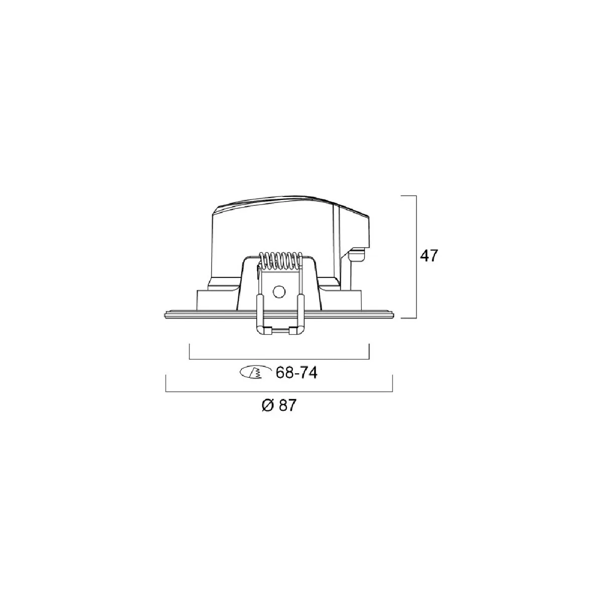 Corps en polycarbonate blanc (RAL9016) avec finition extérieure circulaire plate. Diamètre extérieur 87 mm, diamètre de découpe 6874 mm. Profondeur d'encastrement 47 mm, poids unitaire 0,087 kg. Flux lumineux de 480 lm pour une consommation de 5 W et température de couleur 4000 K (code 840). Angle de diffusion 38°; inclinaison verticale 30° pour un éclairage directionnel contrôlé.