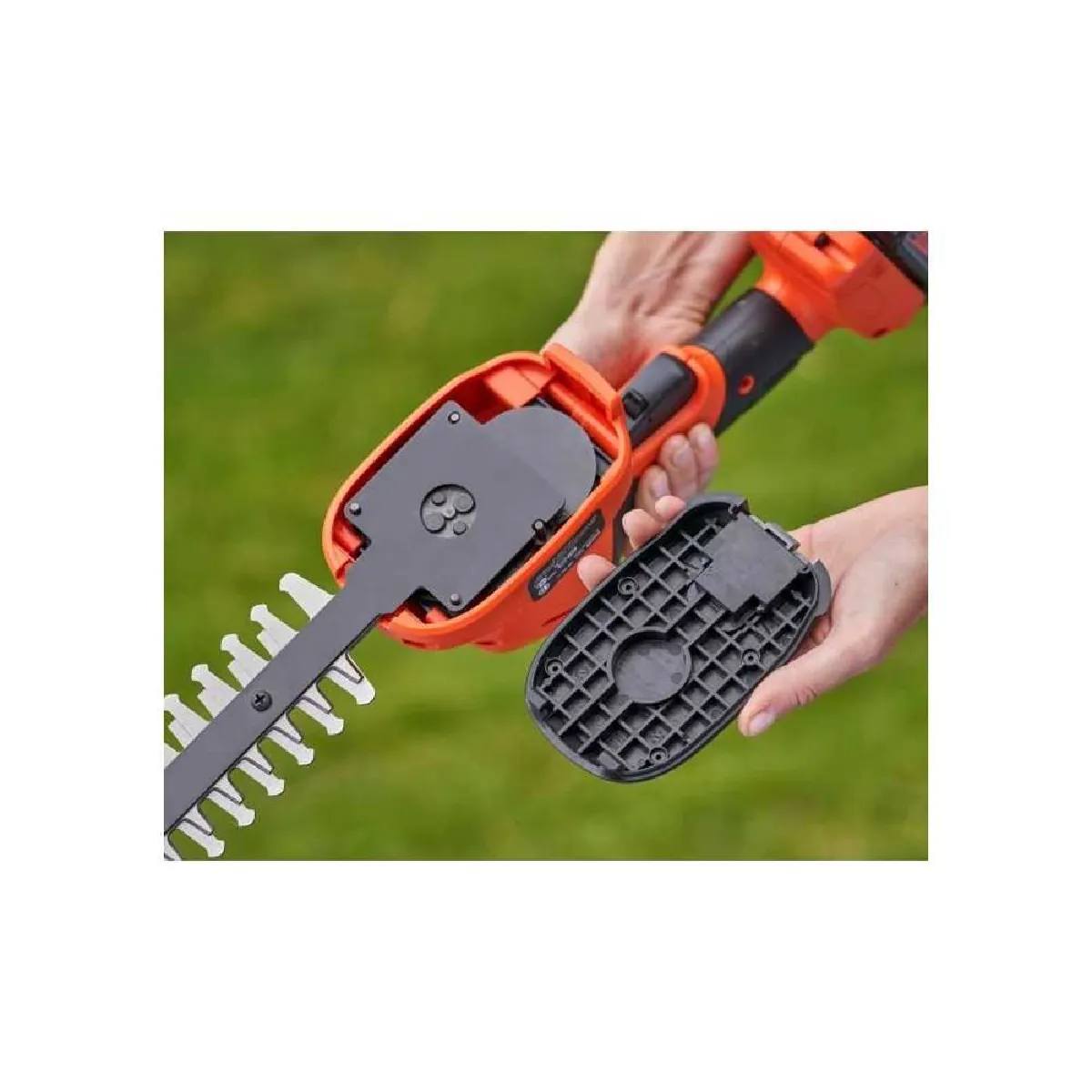 - Lames interchangeables : têtes facilement échangeables par simple pression pour passer rapidement de la cisaille à gazon au sculptehaies.