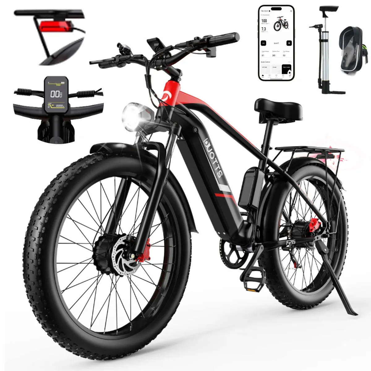 Le F26 intègre un écran LCD couleur multifonction affichant en temps réel vitesse, autonomie et distance parcourue. Connecté via Bluetooth à lapplication DUOTTS, il permet de gérer le tempomat, le mode de démarrage (zéro/non-zéro), les unités de mesure et dallumer les feux. Un port USB permet de recharger votre téléphone en déplacement, et une torba étanche pour téléphone est fournie, optimisant la praticité.