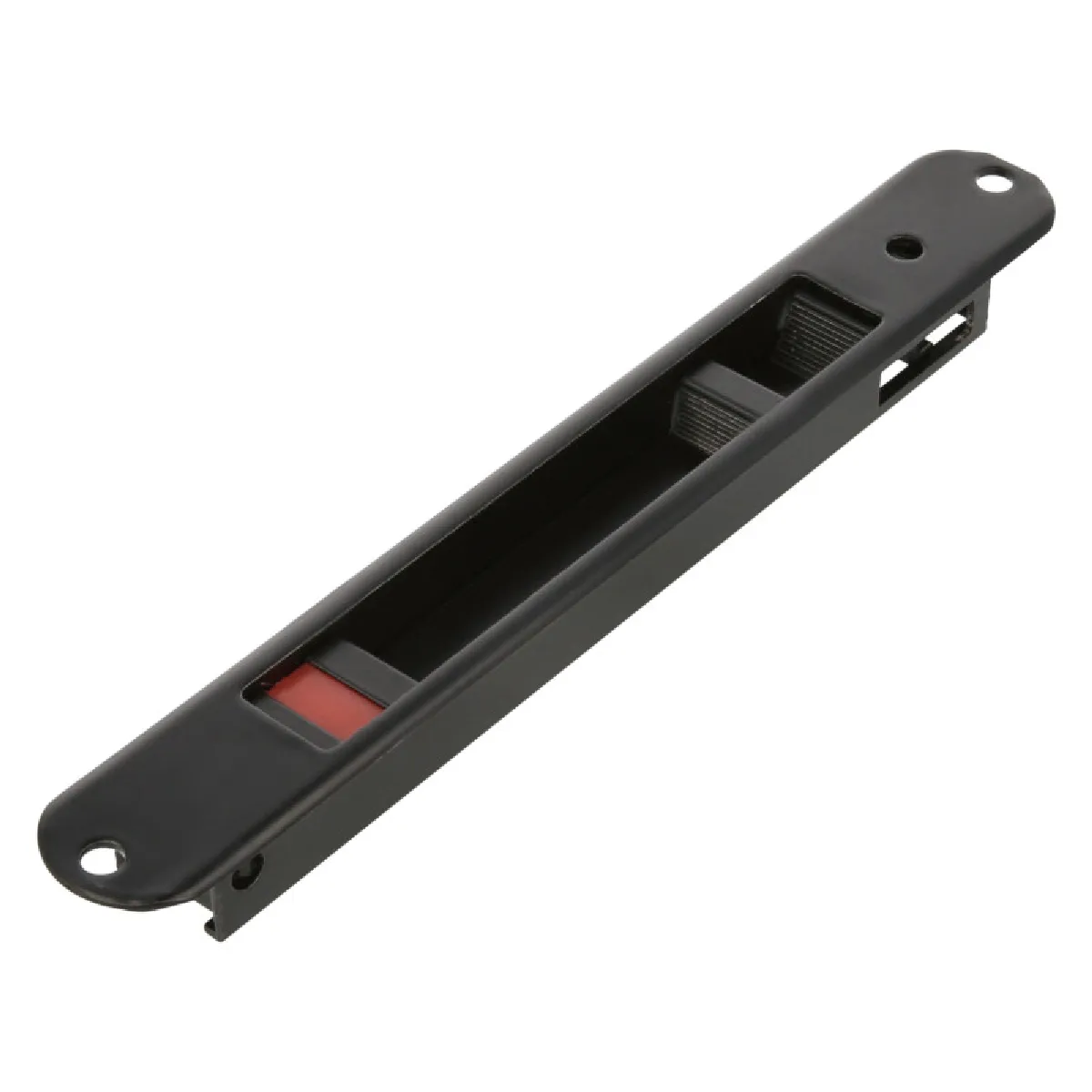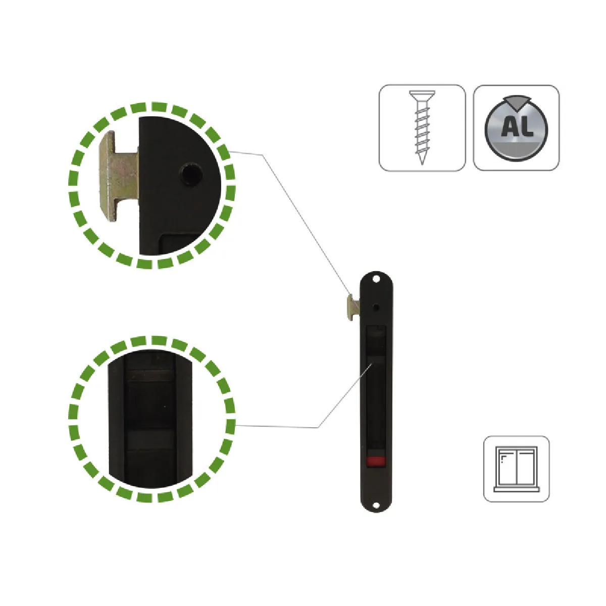 Fermeture encastré en aluminium. Pour les fenêtres et les portes coulissantes en aluminium. Verrou étroit à visser avec un bord arrondi. Serrure à mortaiser en aluminium de haute qualité. Elle peut être installée sur des portes droites ou gauches, grâce au crochet de fermeture interchangeable. Elle est dotée d'un bouton-poussoir antidérapant avec indicateur de fermeture.