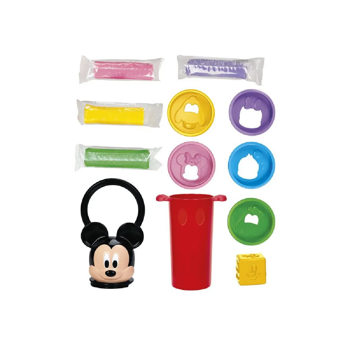 - Couleurs : tampon Mickey noir/visage beige, base rouge, disques jaune/violet/rose/bleu/vert, bâtons de pâte rose/violet/jaune/vert, moule cube jaune.