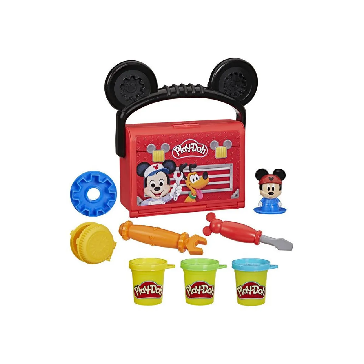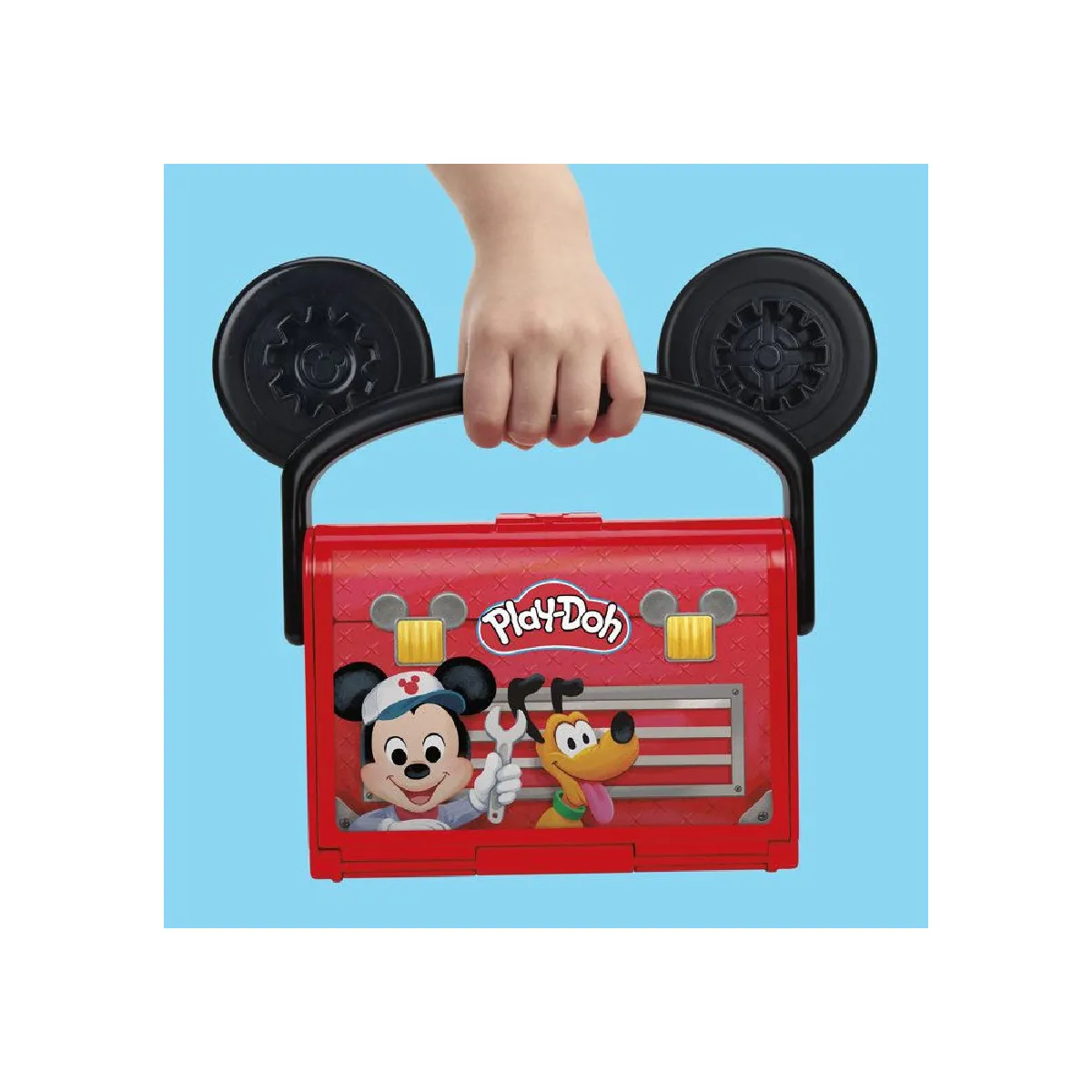 Play-Doh Disney Junior Mon Garage avec Mickey Mouse - Set de modelage portable, 3 pots Play-Doh 56 g, outils et moules, mallette transport - Dès 2 ans