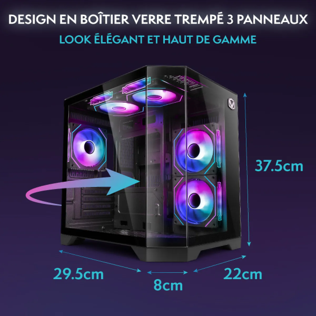 Le VTX-8 noir offre un style audacieux et des performances efficaces dans un format compact. Équipé de ventilateurs RVB Infinity de 120 mm et dun superbe panneau frontal RVB à miroir infini, il apporte un éclairage vibrant et un flux dair performant à votre configuration. Son design gain de place le rend idéal pour des builds épurés et minimalistes, sans compromis sur lesthétique ni la fonctionnalité. Le VTX-8 noir est un choix remarquable pour les gamers qui recherchent puissance et personnalité dans un format réduit.