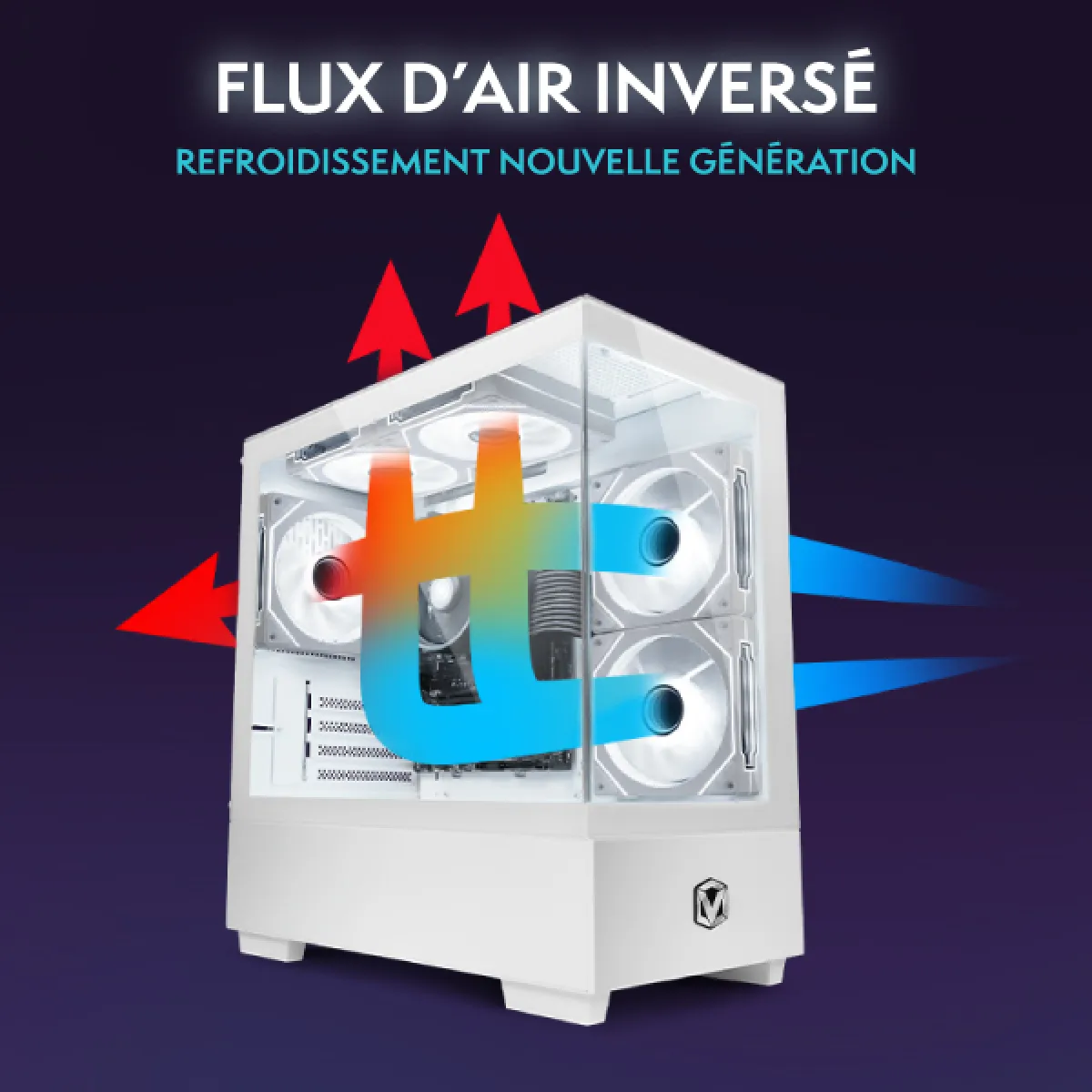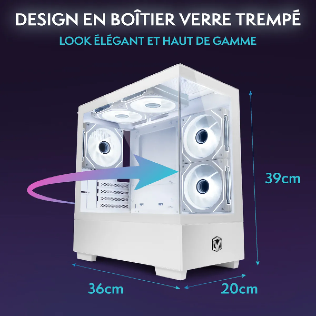 Le VTX-4 Blanc offre un style audacieux et des performances efficaces dans un format compact. Équipé de ventilateurs RVB Infinity de 120 mm et dun superbe panneau frontal RVB à miroir infini, il apporte un éclairage vibrant et un flux dair performant à votre configuration. Son design gain de place le rend idéal pour des builds épurés et minimalistes, sans compromis sur lesthétique ni la fonctionnalité. Le VTX-4 Blanc est un choix remarquable pour les gamers qui recherchent puissance et personnalité dans un format réduit.