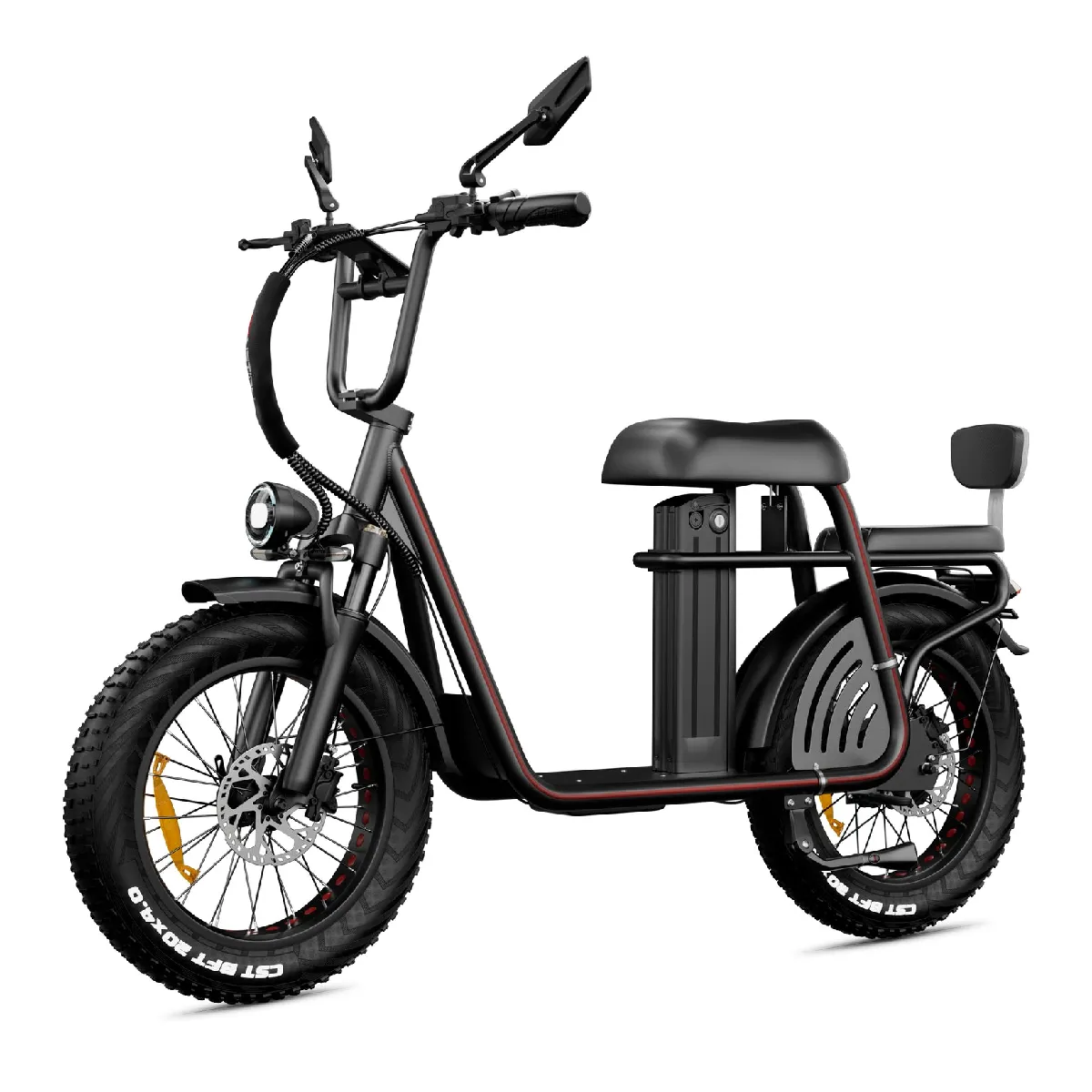 Disponible en noir et orange (deux coloris modernes), son design robuste sadapte aussi bien à la ville quaux terrains en relief grâce à ses pneus épaissis 20*4.0 (stabilité sur tous les sols, quil sagisse de trottoirs ou de chemins de terre)."