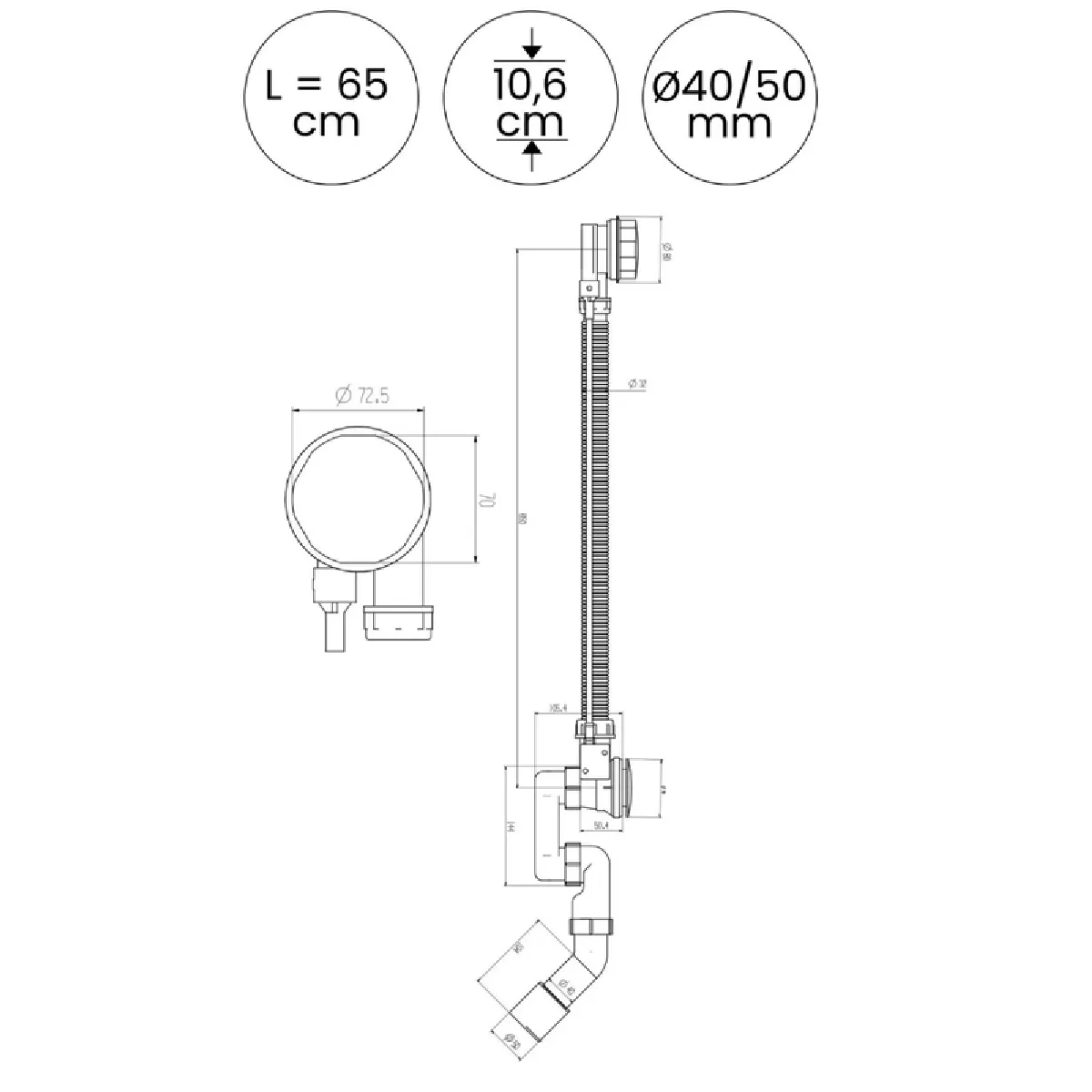 OTITEC Vidage baignoire avec trop-plein - Bonde chrome - Flexible |