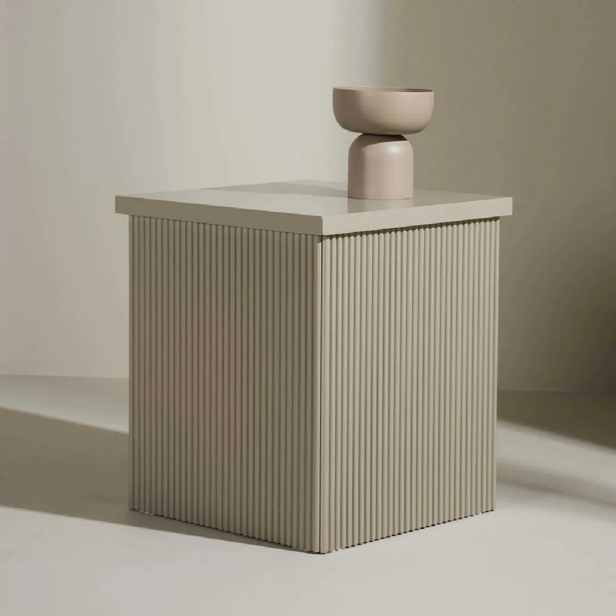 Commentaire vendeur : Informations Techniques : Dimensions : L. 40 x l. 40 x H. 45 cm Plateau : H. 2,5 cm Matière : MDF Spécificités : Moderne & Intemporelle Table d'appoint carrée Design nervuré Poids max supporté : 50 kg Poids : 13 kg Couleur : Beige