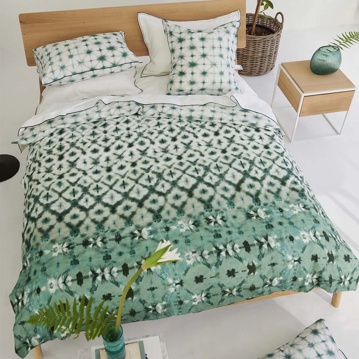 Un parfait équilibre entre douceur et légèreté ce modèle emblématique de linge de lit dévoile un motif tie-dye aux nuances délicates évoquant la teinte de l'Eau de Nil. La création de ce motif repose sur une impression numérique méticuleusement réalisée sur un percale de coton luxueuse. La touche finale de l'ensemble se trouve sur la taie d'oreiller, ornée avec soin d'une finition en ruban gros grain dans une nuance émeraude élégante.