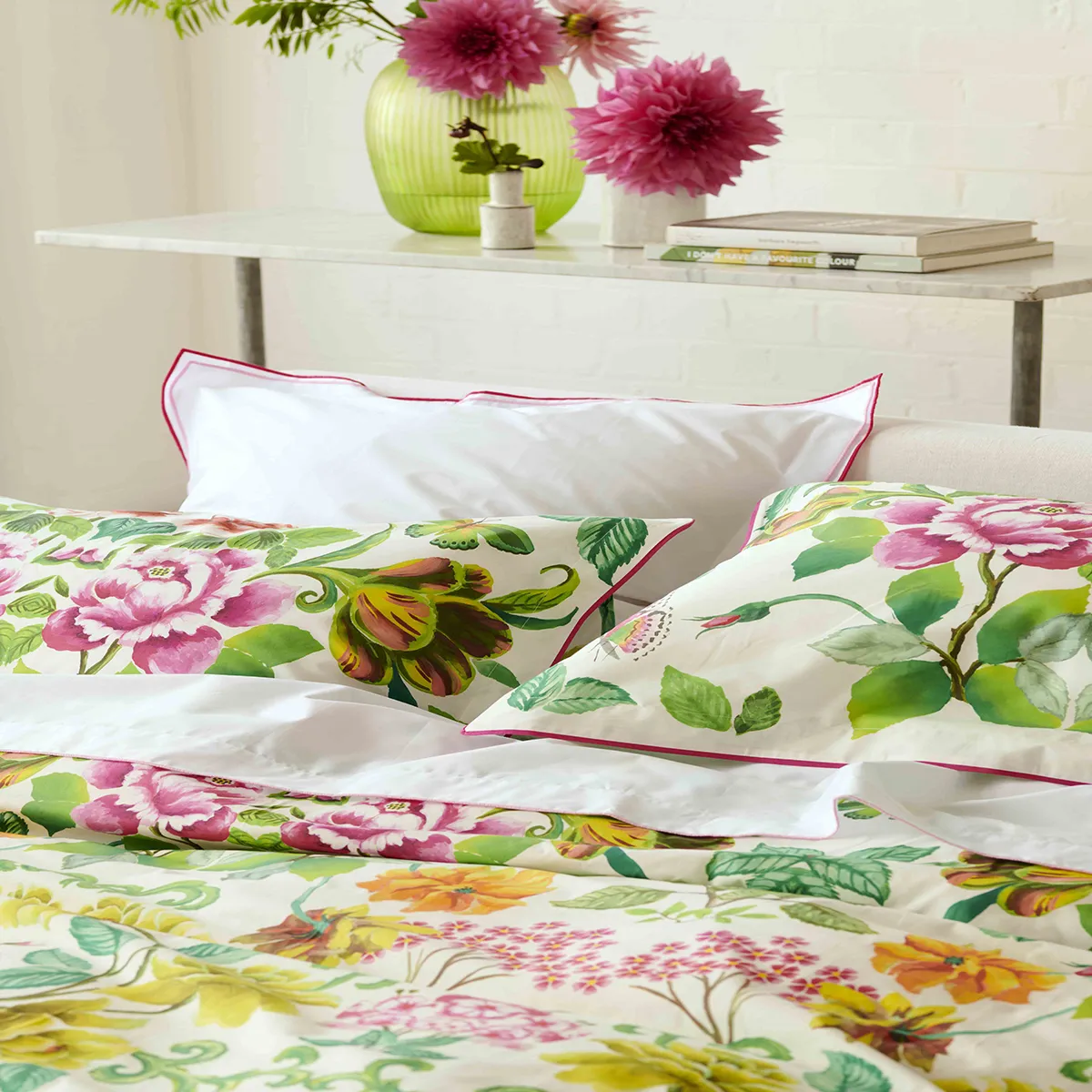 Plongez dans un univers de fraicheur et de sophistication avec le linge de lit Eleonora Emerald. Ce modèle éblouissant présente un motif floral luxuirant, aux couleurs vibrantes et riches, qui apporte une touche de vitalité de re romantisme à votre chambre. En percale de coton, il garantit un confort optimal et un toucher soyeux pour des nuits paisibles. Son design harmonieux combine audace et élégance pour un charme intemporel. Chaque détail a été soigneusement pensé: la taie d'oreiller est sublimée par un élégant ruban gros grain rose fuchsia.