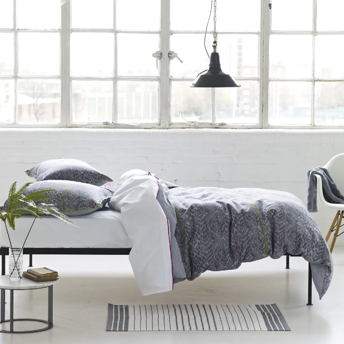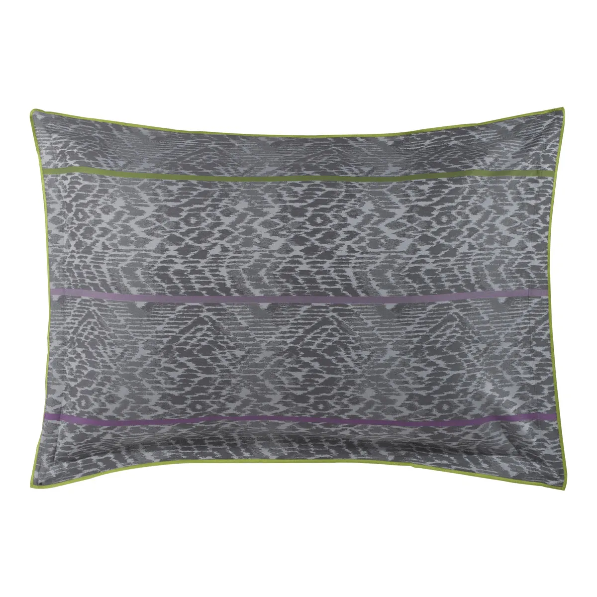Bandela est un linge de lit aux motifs animaliers traités façon ikat. Il est nuancé de plusieurs tons gris doux et souligné par une impression de rubans aux couleurs vives magenta et vert citron. Le coordonné est un faux uni couleur gris doux.