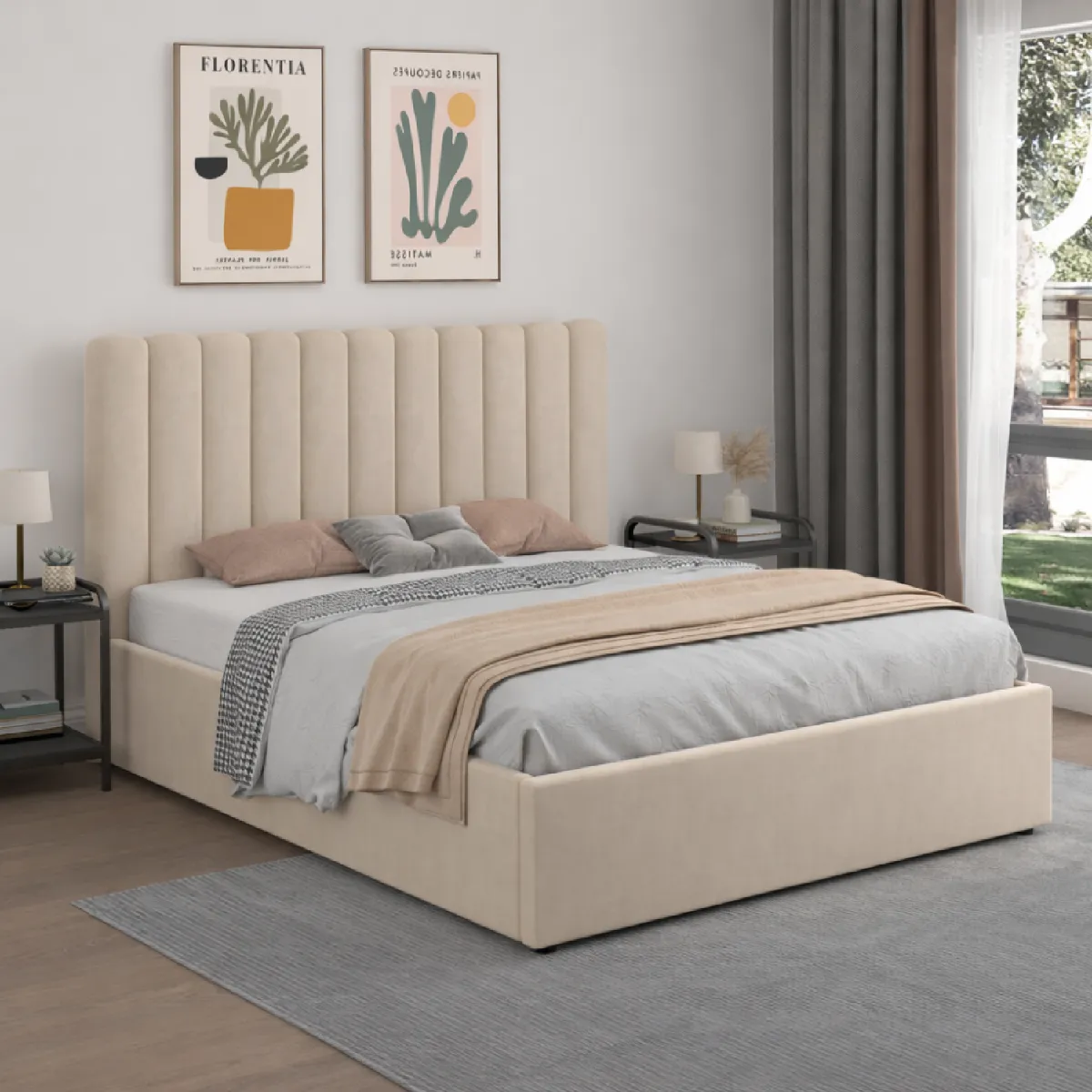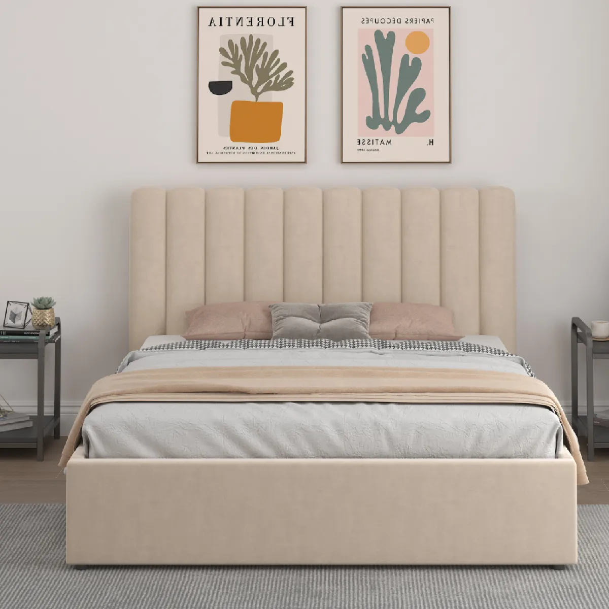 Son revêtement en velours apporte douceur et raffinement, tandis que sa tête de lit élégamment structurée crée une atmosphère chaleureuse et sophistiquée, idéale pour un intérieur moderne.