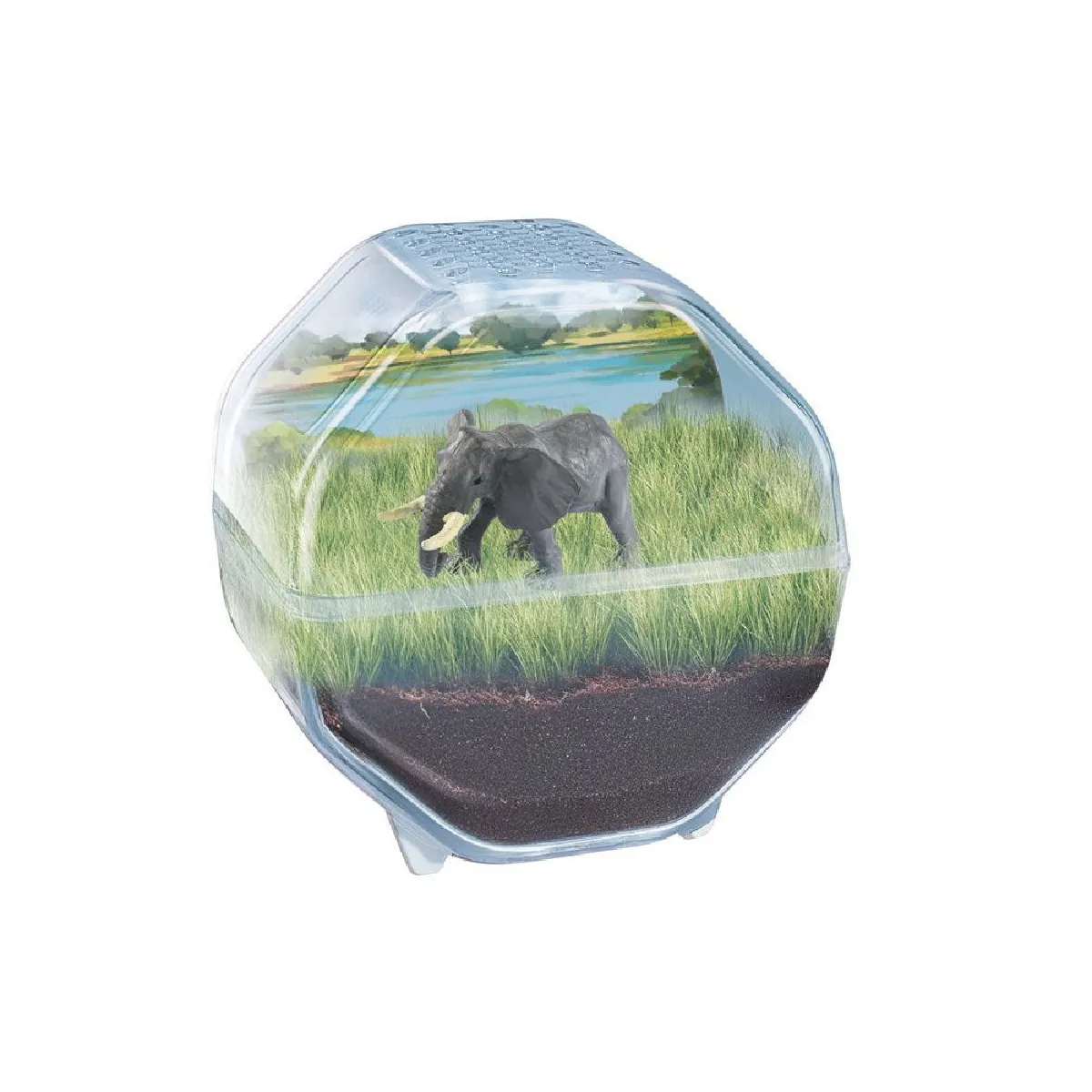 - Contenu du coffret : terrarium transparent octogonal (2 pièces), disque de tourbe, graines de gazon, figurine d'éléphant, décor de milieu, notice en français.