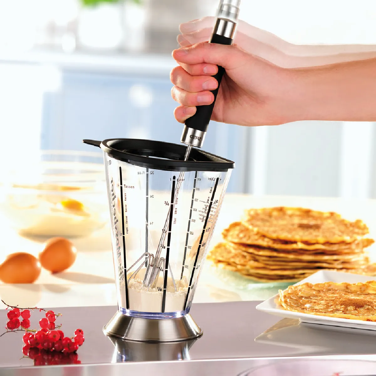 Le fouet universel est lustensile parfait pour tous les amateurs de légèreté et donctuosité. Idéal pour la préparation rapide et facile de lait mousseux, sauces, desserts, potages etc. Appuyer tout simplement sur la poignée. Le fouet mélange aussitôt et séduit son utilisateur par son principe de fonctionnement fiable et son maniement facile avec un effort minime. Discret et talentueux ! - Facile et rapide, fonctionne avec un léger mouvement de la main- Rincer à l'eau courante