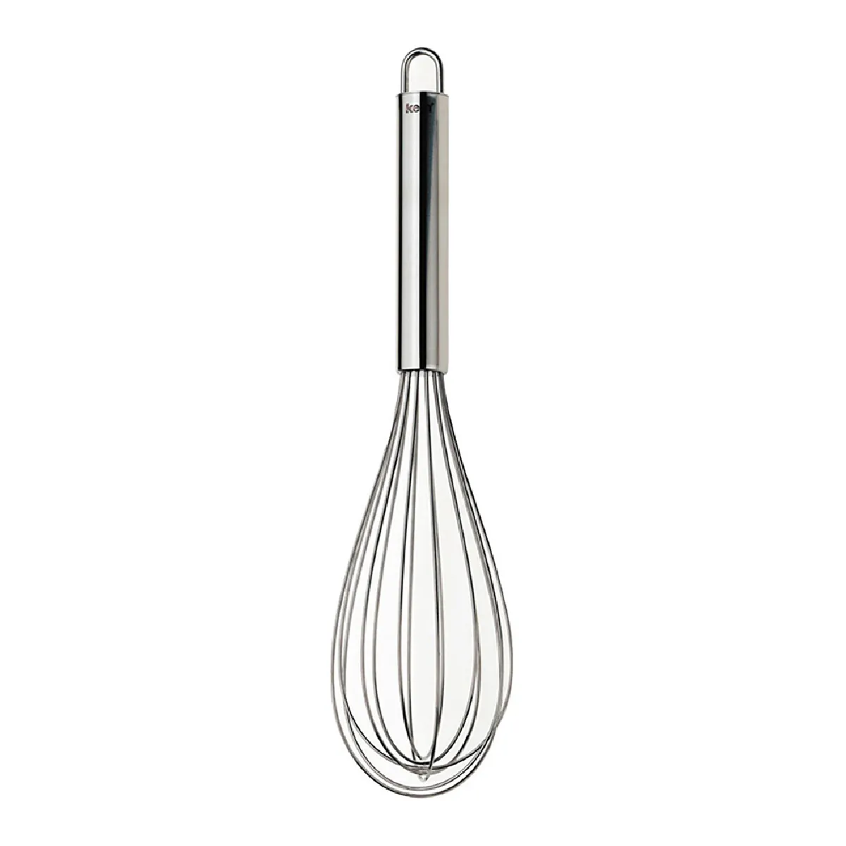 Fouet Rondo KELA, longueur 32 cm, en acier inoxydable. Accessoire de cuisson robuste et hygiénique, conçu pour mélanger pâtes, sauces, crèmes et soupes. Manche ergonomique en inox avec boucle de suspension pour un rangement pratique. Compatible lave-vaisselle, entretien facile. Article compact et polyvalent, idéal pour compléter une gamme d'ustensiles de cuisine durable destinée à la revente.