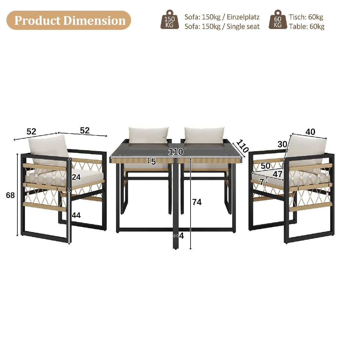 Dimensions (L x l x H) Canapé individuel : 52 x 52 x 68 cm Table : 110 x 110 x 74 cm Couleur Beige + Noir Poids du produit 61,95 kg Matériau Fer, verre et tissu Capacité de charge 150 kg par place, 60 kg pour la table Contenu de la livraison 4 canapés individuels, 1 table Nombre de colis 3Livraison en 3 colis, ils peuvent ne pas arriver en même temps, veuillez patienter s'il vous plaîtInformations importantes : Informations importantes : En raison des réglages d'éclairage ou d'affichage, la couleur réelle du produit peut légèrement différer de l'image. Les mesures étant prises manuellement, une légère marge d'erreur est possible. Ce produit est livré en plusieurs colis ; les délais de livraison peuvent varier. Merci de votre compréhension.