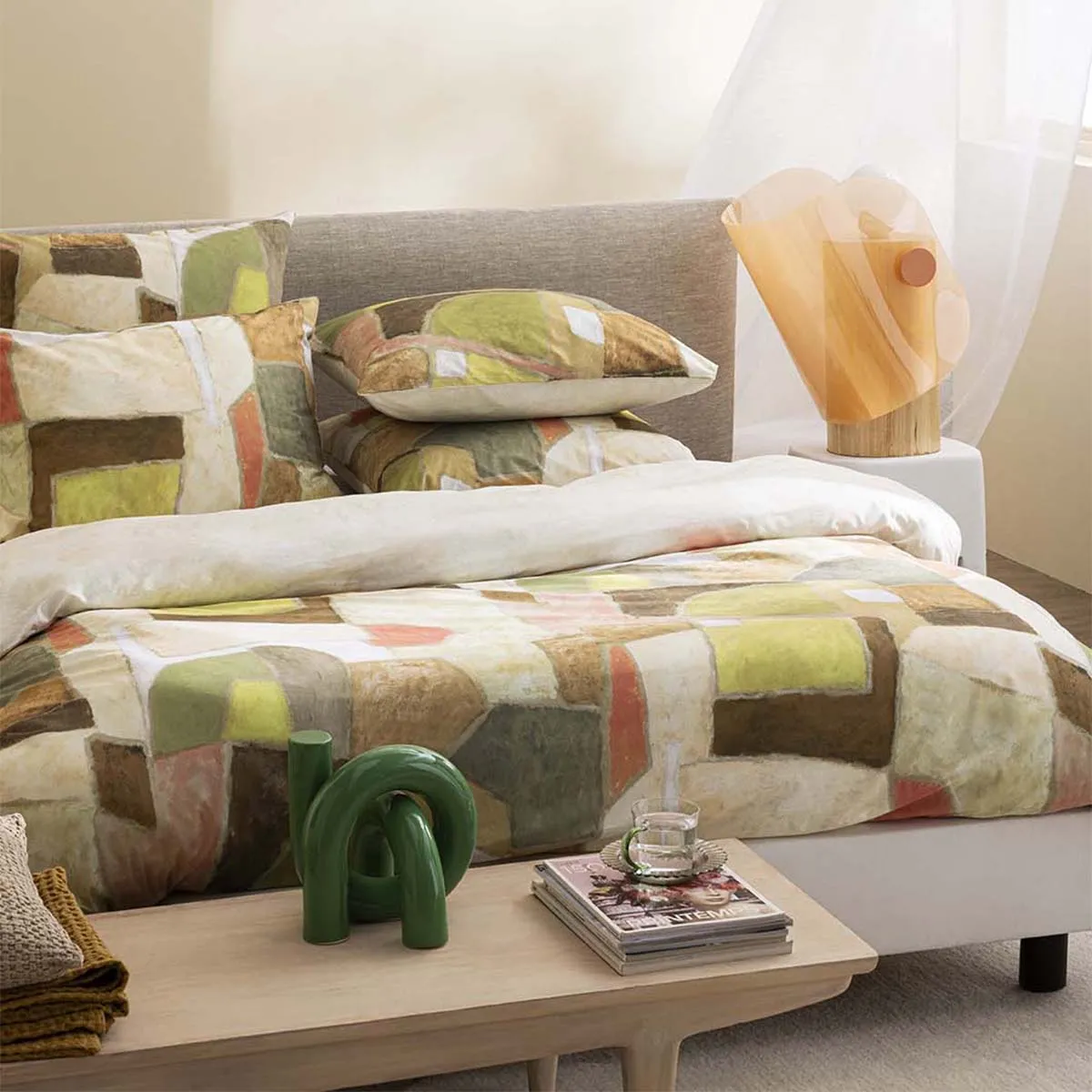 Plongez dans l'univers artistique de Clay Collage, une création audacieuse qui transforme votre chambre en galerie d'art contemporain.Les blocs colorés aux contours irréguliers dessinent une mosaïque sophistiquée dans une palette de verts olive, d'ocres chaleureux et de beiges crémeux. La housse de couette réversible offre deux ambiances distinctes : un côté aux motifs géométriques affirmés pour une décoration audacieuse, et un côté plus subtil aux tons adoucis pour une atmosphère apaisante.Faites de votre chambre un écrin d'originalité et de raffinement contemporain.