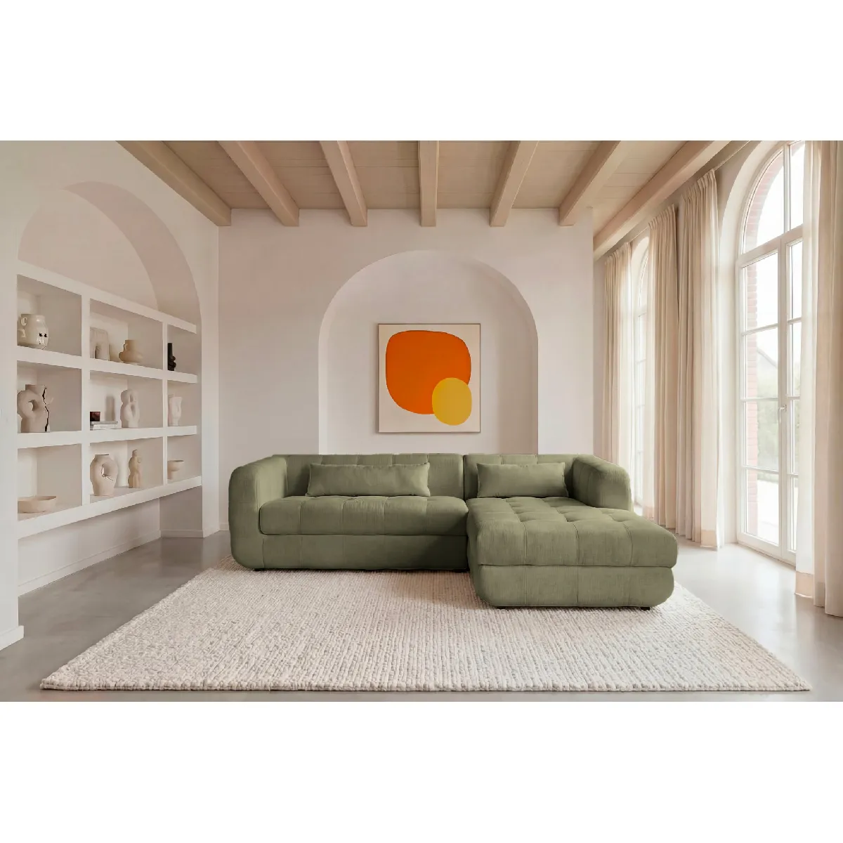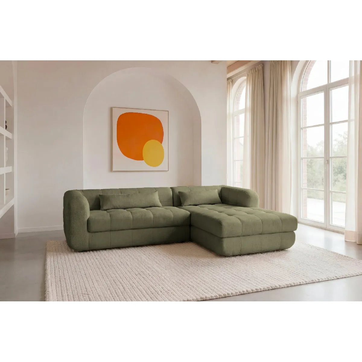 Le canapé ARLETTE Angle combine un format généreux et un design enveloppant pour offrir un espace de détente confortable et convivial. Son tissu chenille apporte une texture douce et chaleureuse, tandis que sa configuration dangle optimise laménagement du salon avec élégance.