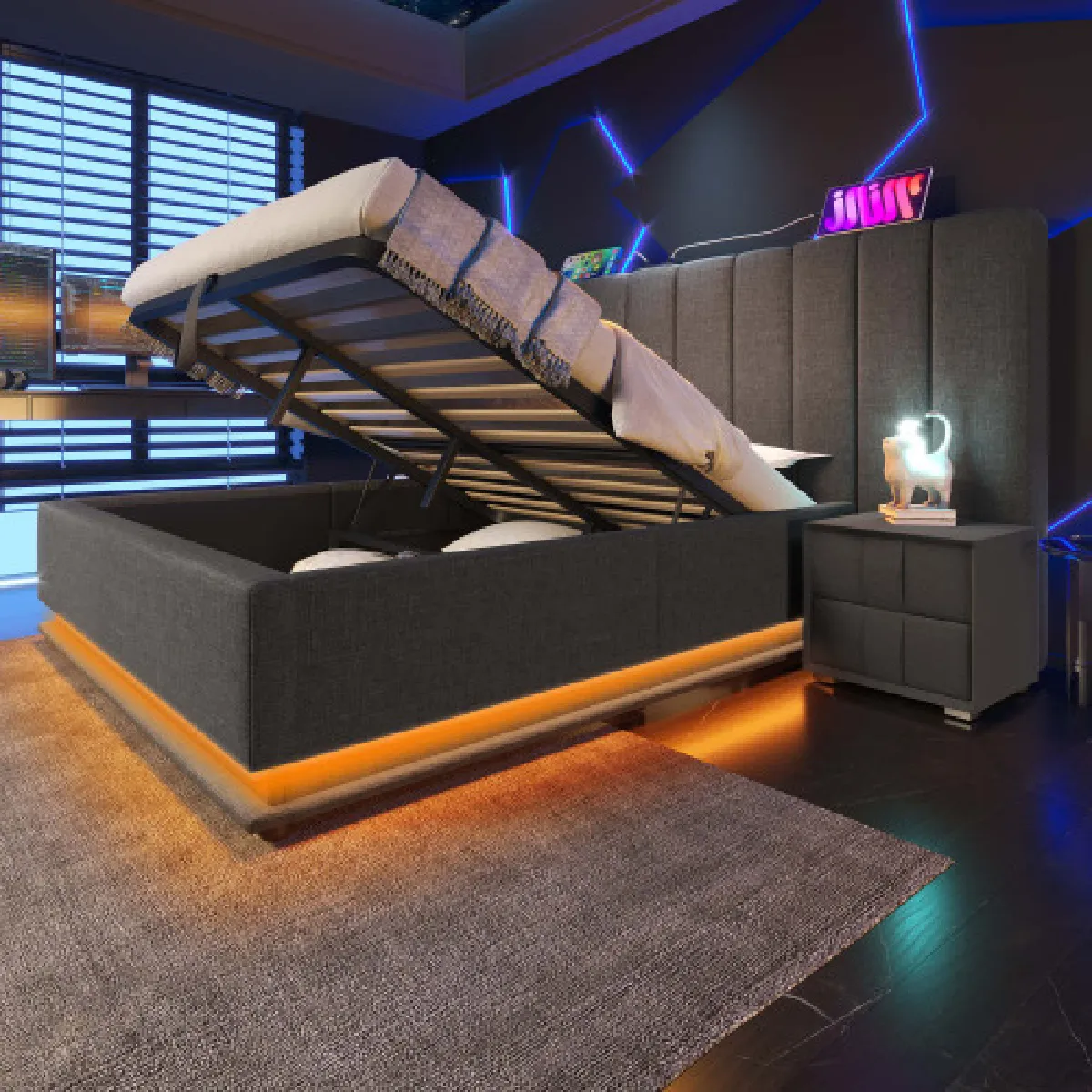 Merax Lit 180x200-lit Double Avec Rangement-éclairage LED-prises USB Et Type-c-en Lin-gris |
