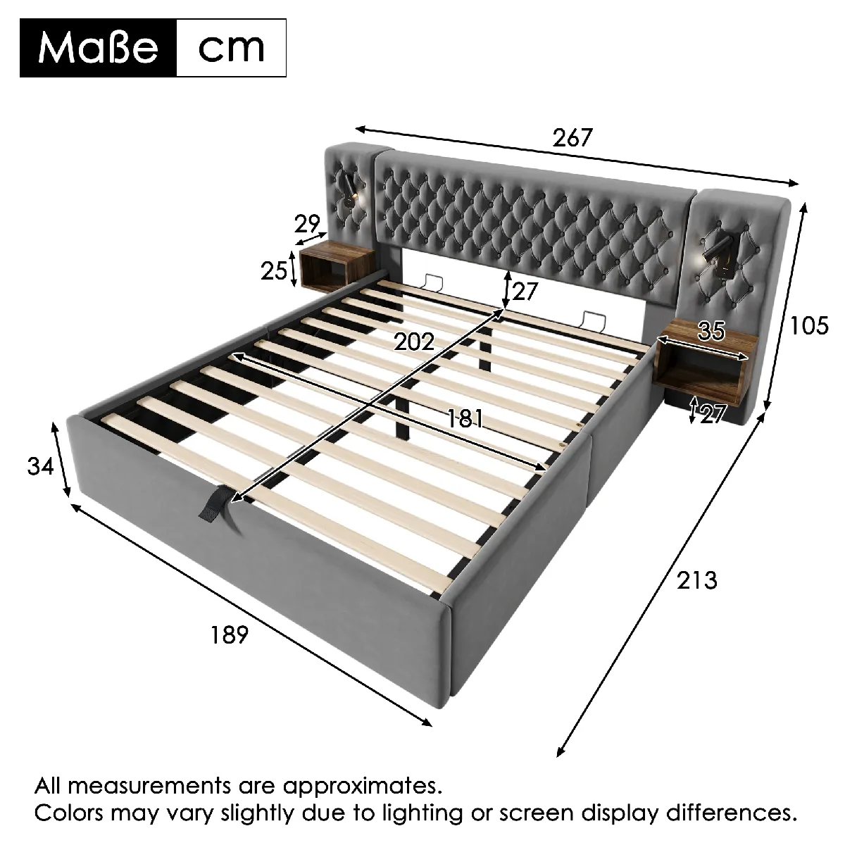 remarque : le sommier est vendu sans matelas ni sommier tapissier. Il est livré avec les outils de base et une notice de montage rapide. Dimensions hors tout : 267 × 213 × 105 cm (l × p × h)