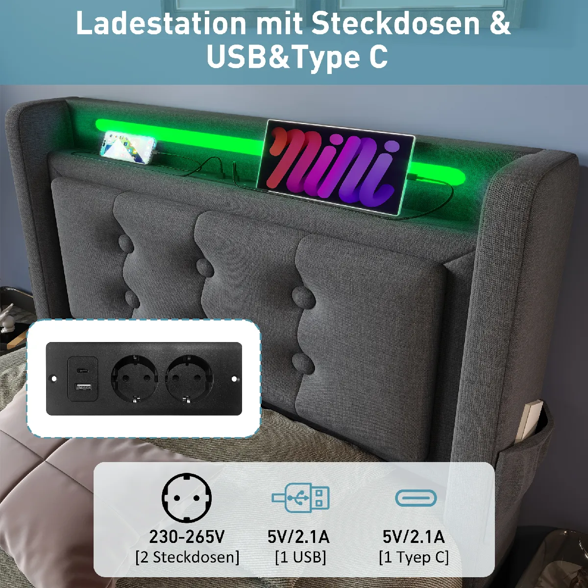 tête de lit avec prises électriques et ports usb : l'une de ses caractéristiques les plus pratiques est la prise électrique intégrée à la tête de lit, vous permettant de recharger votre téléphone et votre tablette avant de vous coucher. Chaque prise est équipée de deux ports de charge standard européens, ainsi que d'un port usb et d'un port usb-c.