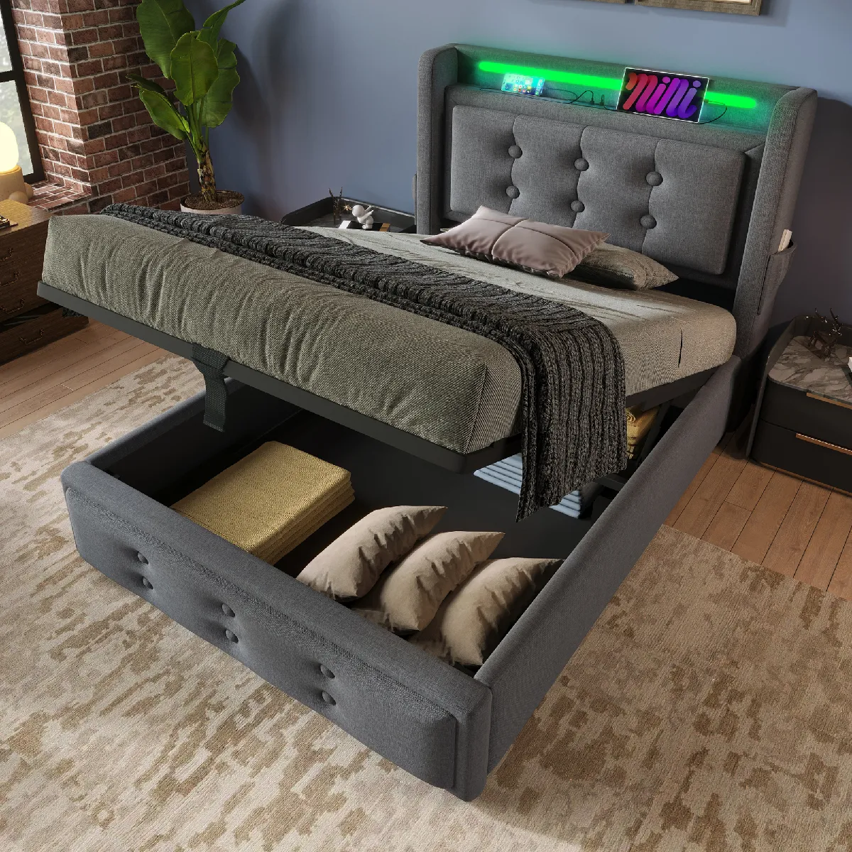 Confortable et pratique : ce lit est confectionné en lin et coton de haute qualité et se décline en deux coloris classiques : gris et beige. La tête de lit est ornée de délicats boutons, lui conférant un style unique et élégant.