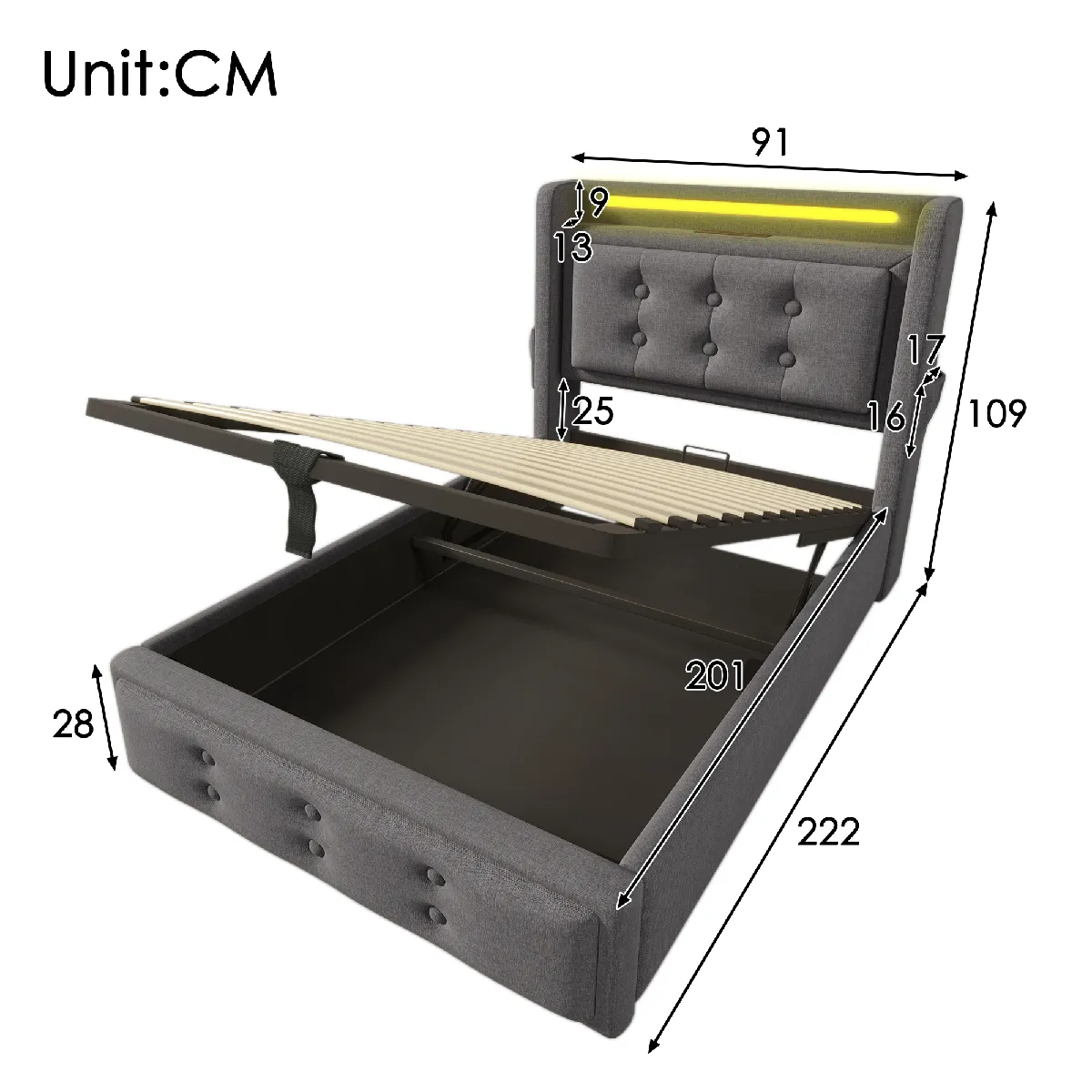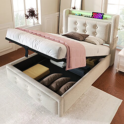 Merax Lit Simple 90x200cm-Tête De Lit LED Et Port USB-c-Rangement Hydraulique-en Bois-gris |