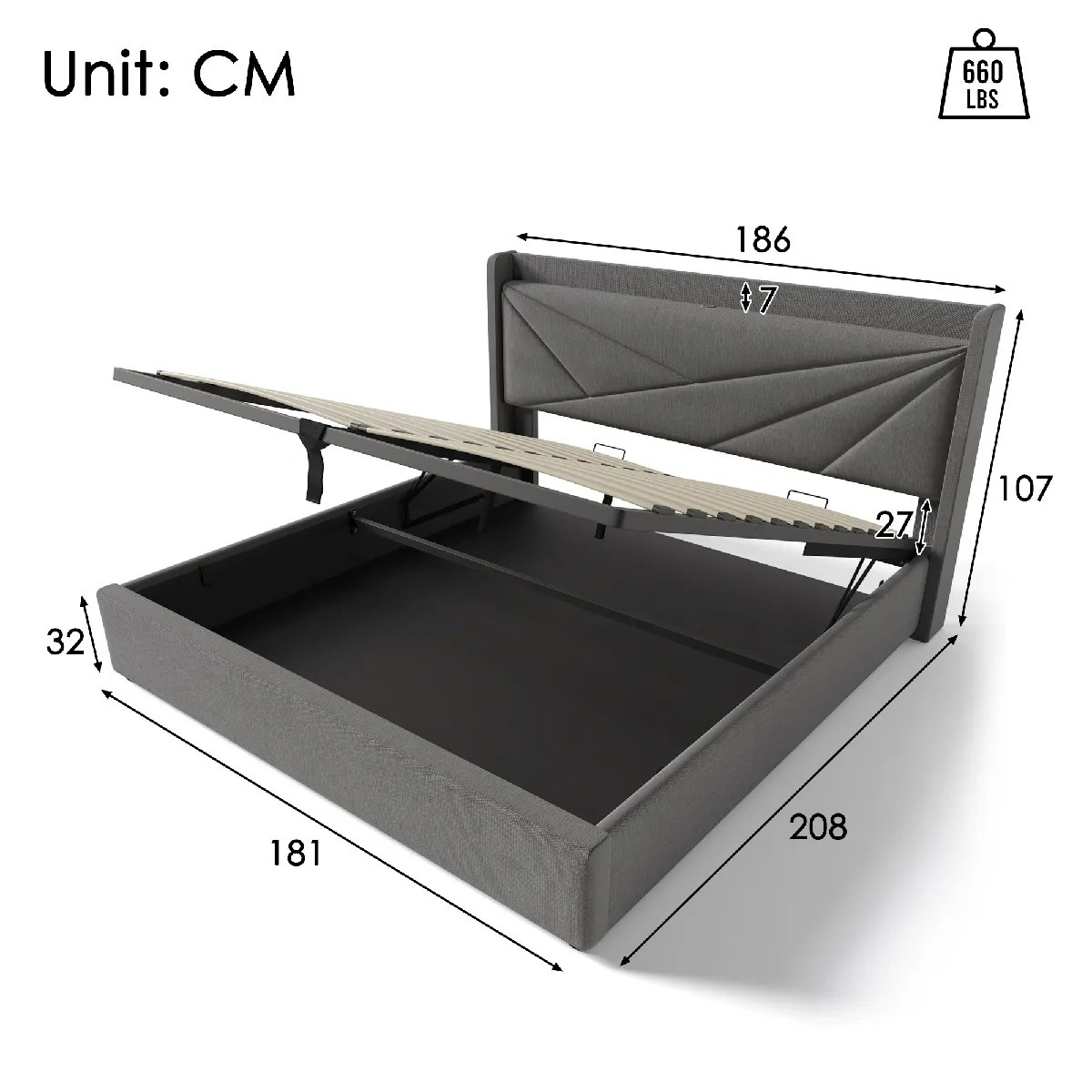 les dimensions hors tout du lit sont de 186 x 208 x 107 cm (l x p x h), et il est conçu pour supporter un poids maximal de 300 kg (660 lb). Le lit est livré avec un sommier inclus, mais sans matelas. Il est compatible avec un matelas de dimensions 180 x 200 cm, que vous pouvez choisir selon vos préférences.