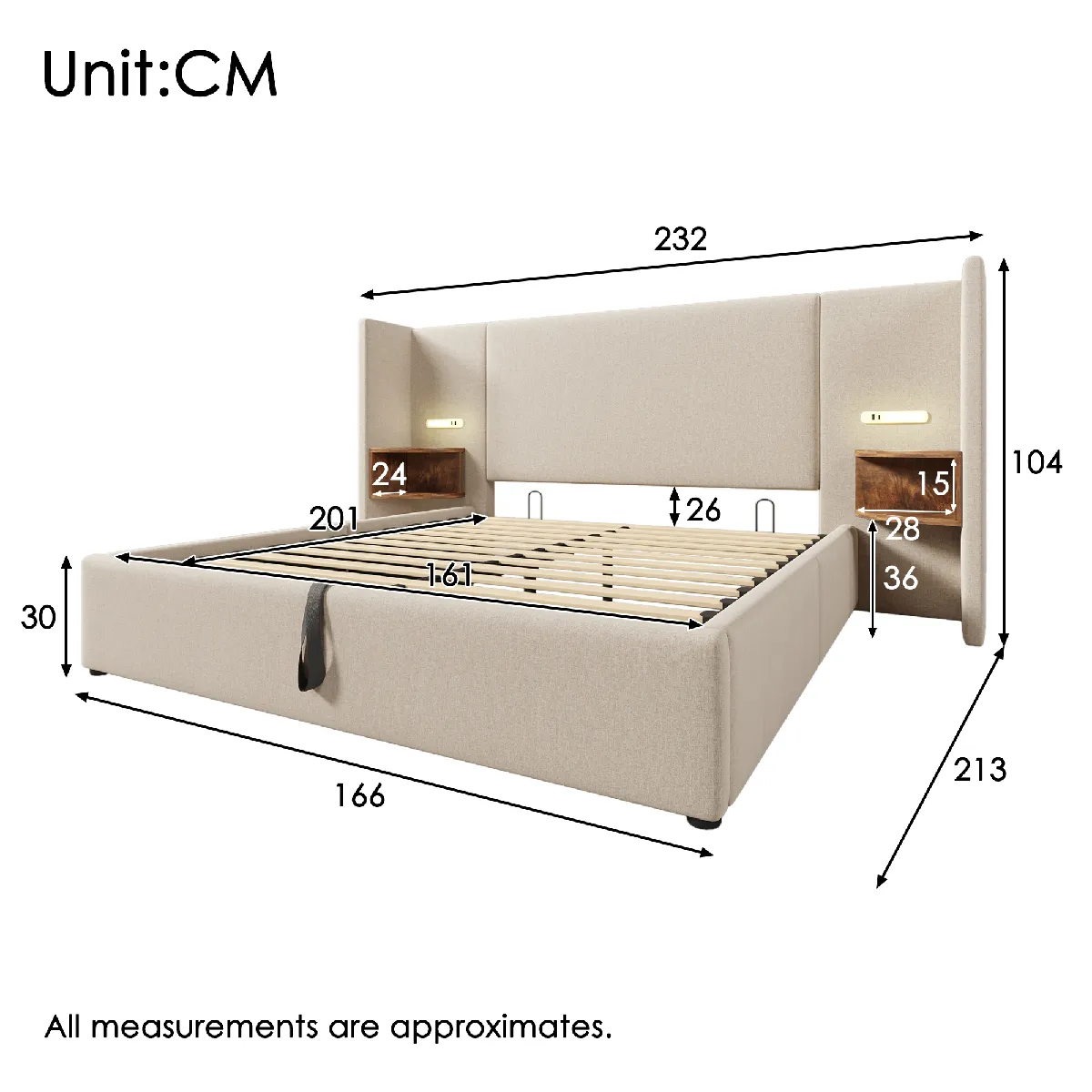 Merax Lit Double 180x200cm-lampe De Lecture-port USB Type-c-système Hydraulique-en Lin-beige |