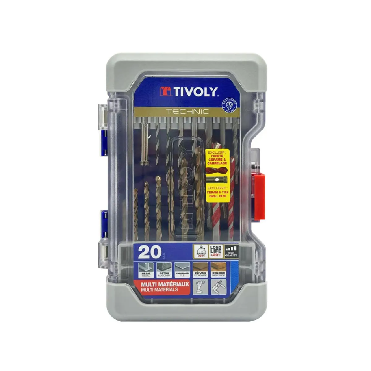 Set de forets multi-matériaux Tivoly 20 pièces présenté dans un coffret Ranger robuste et recyclable. Conçu pour percer grès cérame, aciers, béton, carrelage, pierre, bois et plastiques, ce kit rassemble les types de forets nécessaires pour les travaux professionnels et le bricolage.