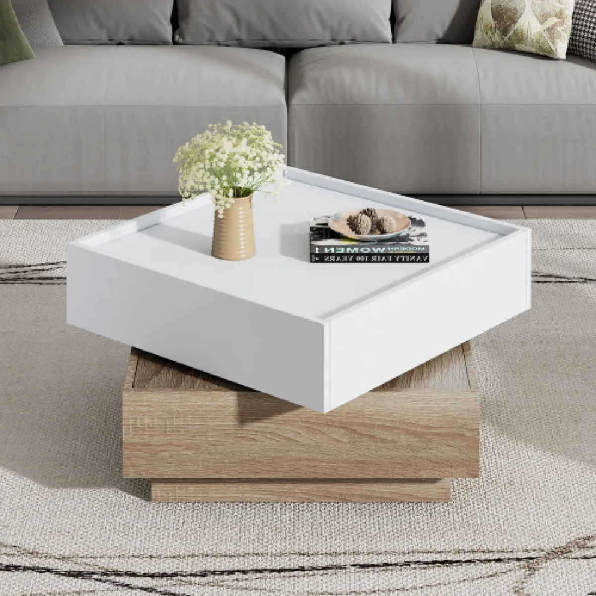 la partie supérieure de cette table basse pivote à 360°. Vous pouvez l'orienter selon vos besoins de rangement et de décoration. Le plateau pivotant offre davantage d'espace pour vos objets décoratifs, livres, tasses de café ou autres boissons. Son design blanc épuré et sa finition noyer lui permettent de s'intégrer à la plupart des intérieurs. La fonction pivotante à 360° vous permet d'adapter la forme de la table et de l'orienter à votre guise.