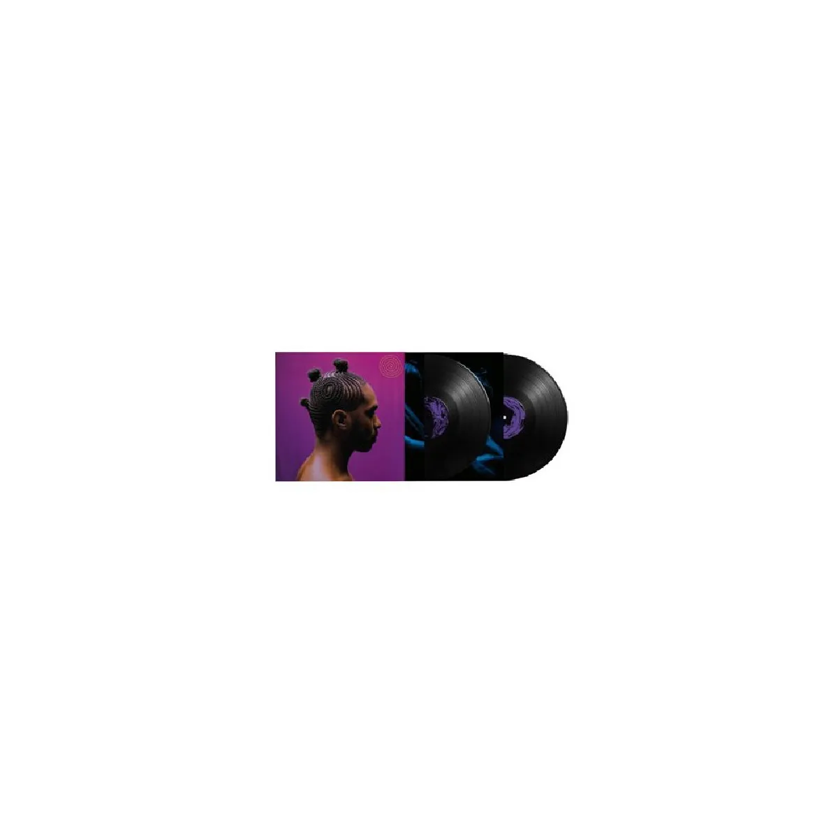 Pressé sur vinyle noir de 12" au format double LP, l'ensemble offre une restitution chaleureuse propice aux passages cinématiques et aux plages dansantes. La pochette au format carré présente une illustration violette frappante avec le profil latéral d'un homme coiffé de petites nattes et un motif de cercles concentriques ; les pochettes intérieures sont sombres avec des motifs bleu et violet, renforçant l'esthétique visuelle du projet.