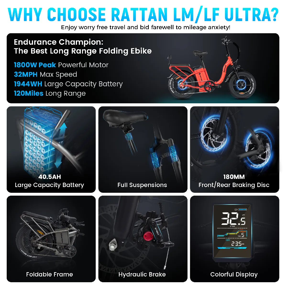 Commentaire vendeur : Vélo électrique pliable Rattan LF Ultra, moteur 48V 1000W (étiquette 250W EU), batterie 40.5Ah, autonomie 130-200km, pneus 20×4.0, freins hydrauliques, Shimano 7 vitesses. Confortable, sécurisé, idéal pour trajets urbains et longs.