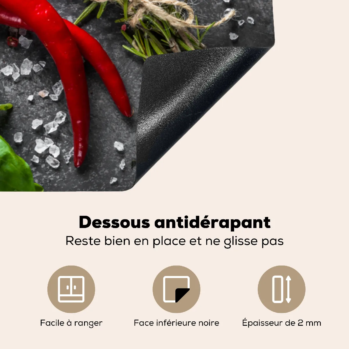 Commentaire vendeur : Vous n'êtes pas satisfait du design de votre cuisine ou vous la trouvez un peu ennuyeuse ? Alors nous avons la solution pour vous ! Avec ce magnifique et luxueux protège-plaques à induction, votre cuisine sera embellie. Le protège-plaques à induction protège non seulement votre plaque de cuisson, mais offre également un espace de travail supplémentaire. Lorsque vous n'utilisez pas votre plaque, vous pouvez placer ce protège-plaques à induction dessus pour la protéger. Améliorez votre cuisine et commandez dès maintenant un protège-plaques à induction avec un imprimé unique.À propos du protège-plaques à induction :Avec notre protège-plaques à induction, vous profiterez encore plus de votre cuisine et vous assurerez que votre plaque ne se raye pas. Le protège-plaques à induction a une épaisseur de 2 mm, offrant ainsi une protection optimale à votre plaque de cuisson. De plus, il lui donne un aspect premium ! Notre protège-plaques à induction est résistant à la saleté et à l'eau, vous pourrez donc le garder propre sans problème. NOTE : Il est très important de ne jamais placer le protecteur sur une plaque de cuisson chaude. Lisez notre manuel pour utiliser le produit en toute sécurité et prolonger sa durée de vie !À propos de l'image: Diverses herbes et épices sur fond de béton.