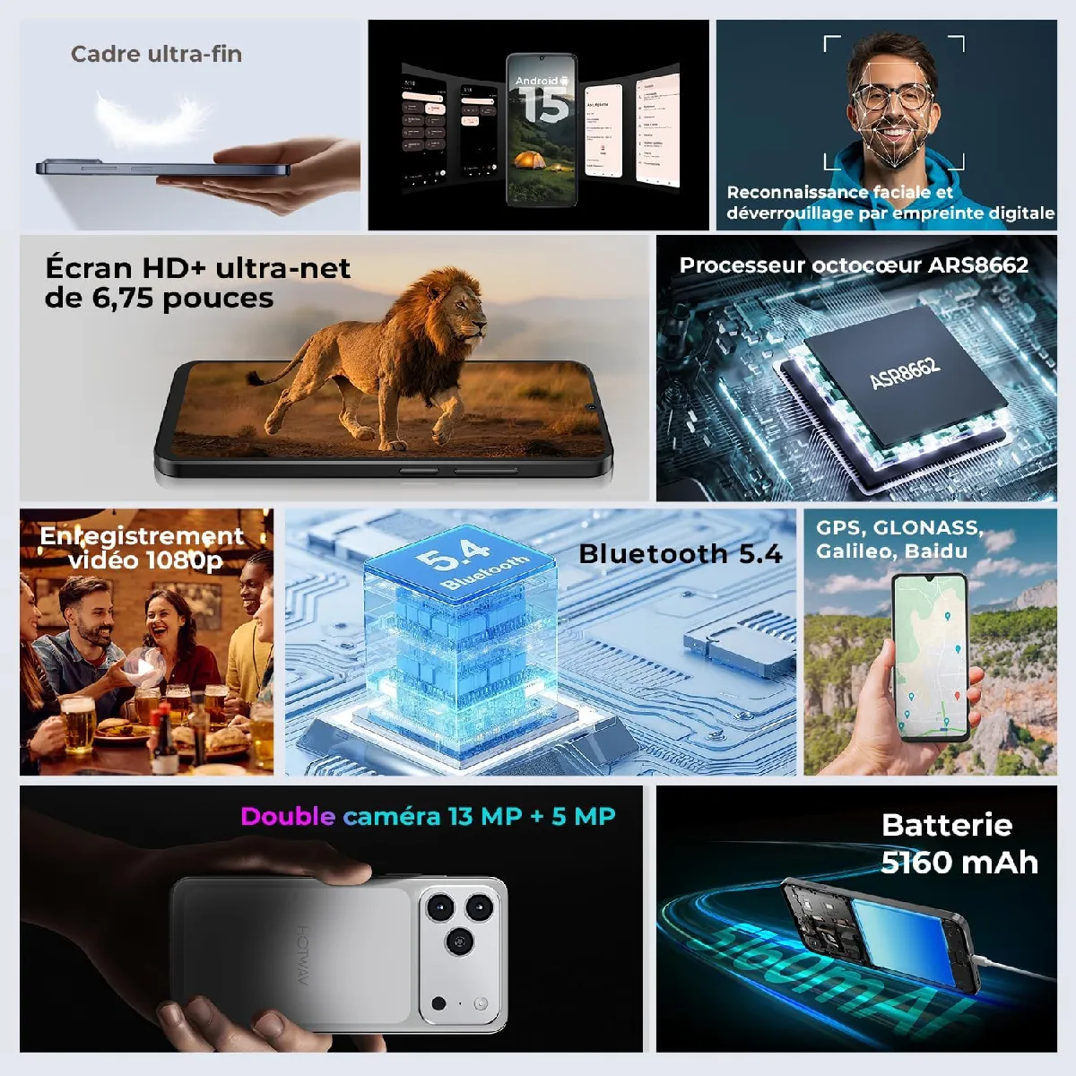 HOTWAV A17 Pro Max Téléphone Portable Débloqué 4G Android 15 Grand Écran 6.75" 120Hz Longue Autonomie Batterie 5160mAh Caméra 13MP Stockage 256GB Octa Core